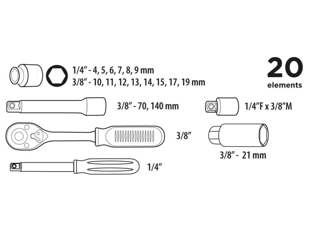 Súprava nástavcových kľúčov ?”, 3/8” 20 ks Materiál – uhlíková oceľ. Račňa 3/8” 39 zubov, predlžovačka 3/8” 140 mm, predlžovačka 3/8” 70 mm, skrutkovacia rukoväť ?”; redukcia 3/8” - 1/4”, nástavec na sviečky 3/8” 21 mm, nástavce 3/8”, 8 ks: 10, 11, 12, 13, 14, 15, 17, 19 mm; nástavce ?”, 6 ks: 4, 5, 6, 7, 8, 9 mm.