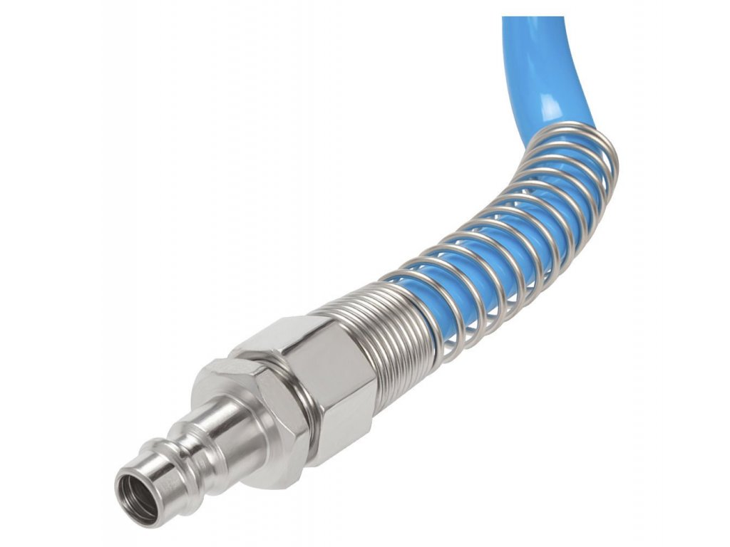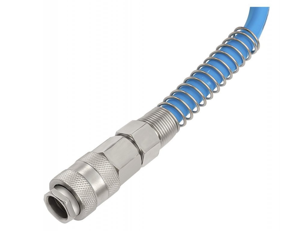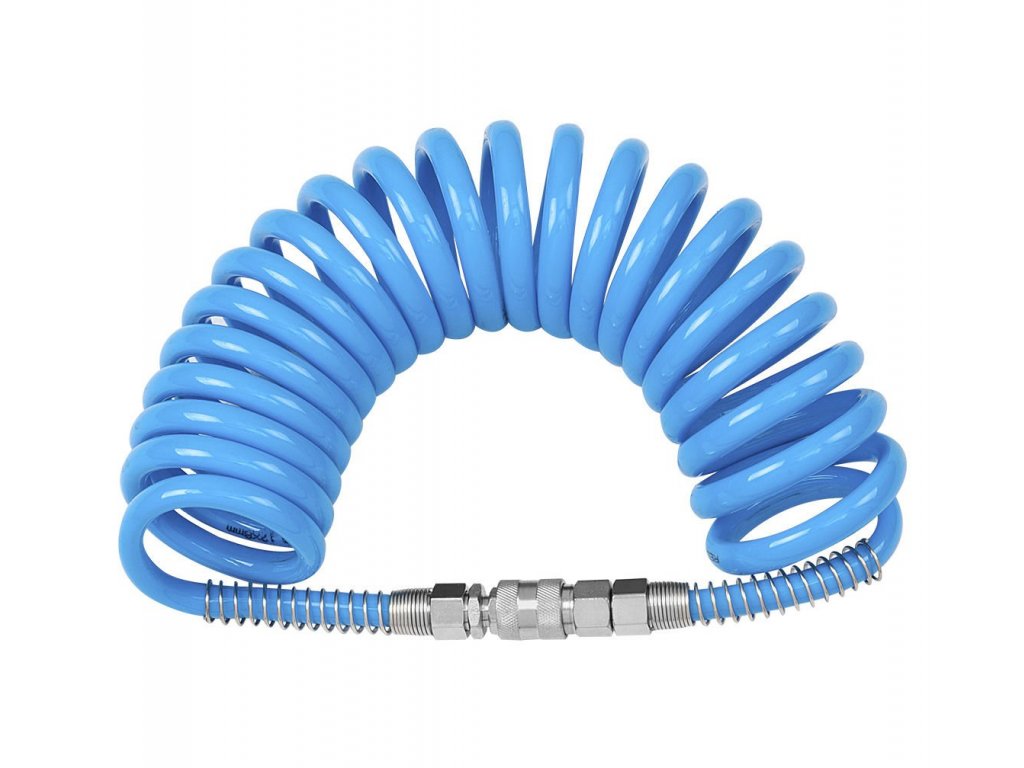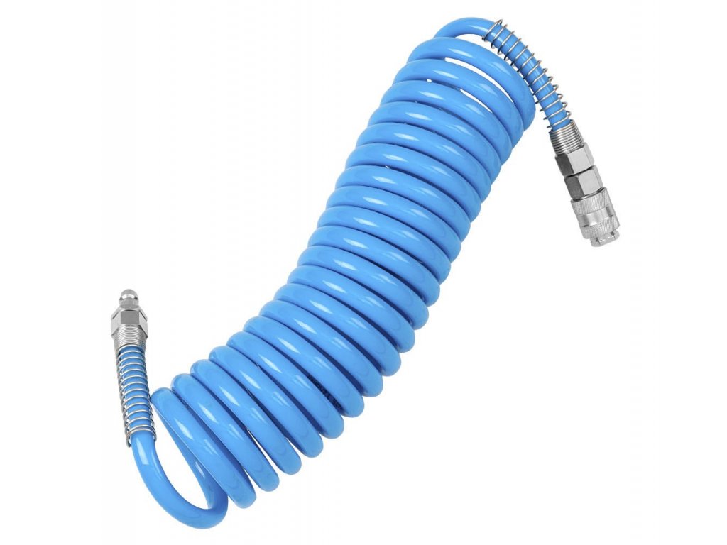 Špirálová pneumatická polyetylénová hadica 12x8 mm o dĺžke 5 metrov štandardnej kvality.
