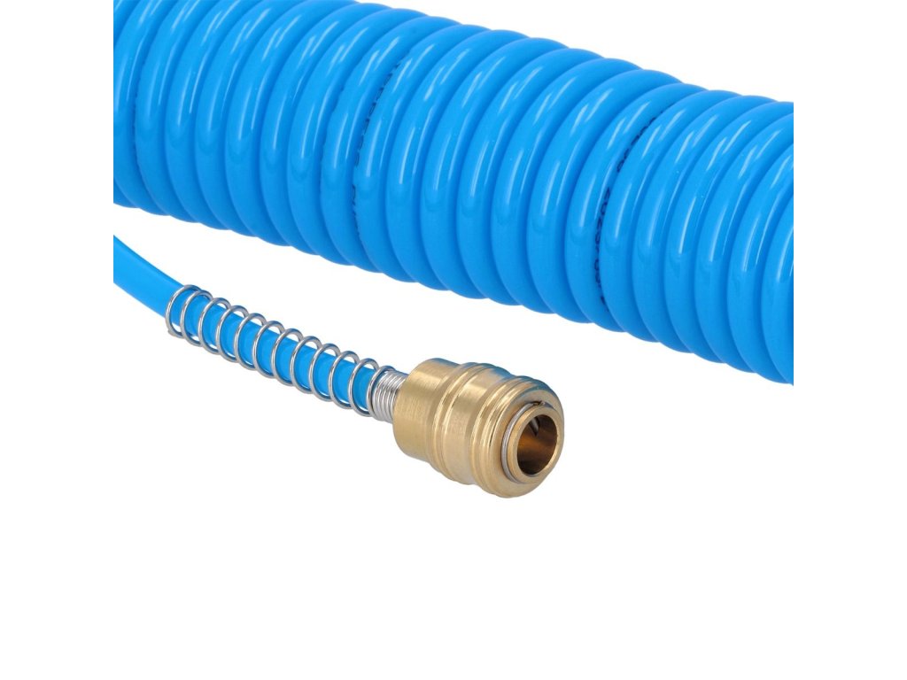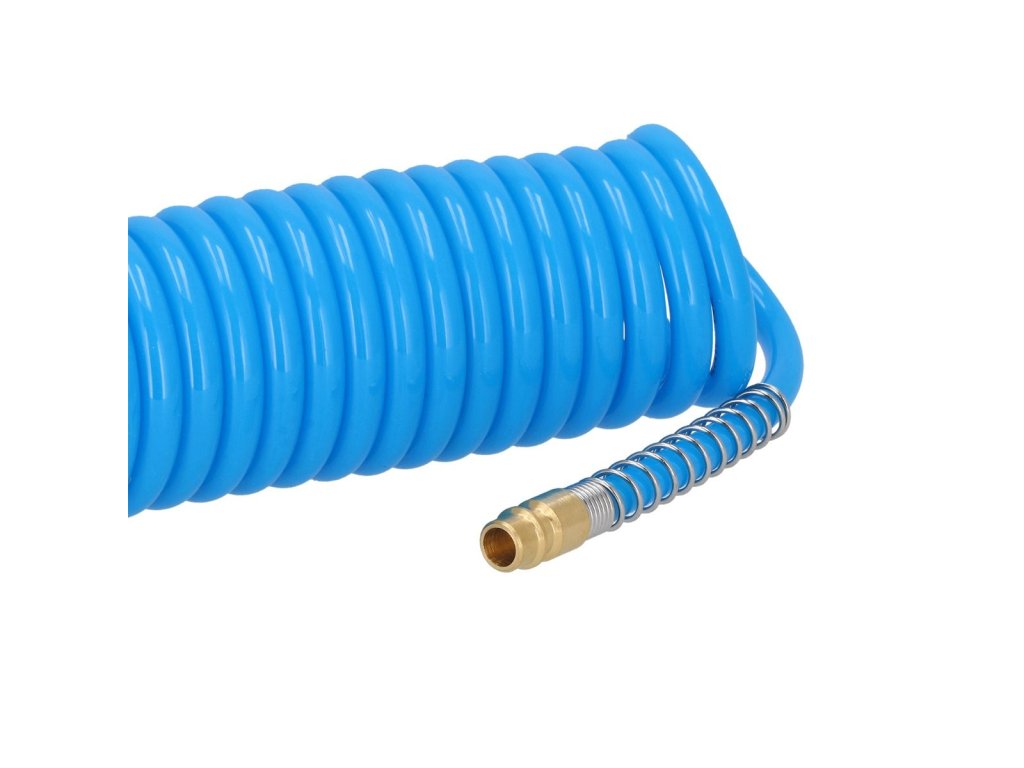 Spirálna pneumatická hadica PU s vystužením 10 m priemer 8 x 5 mm Vysokokvalitná spirálna pneumatická hadica s dĺžkou 10 metrov a priemerom 8 x 5 mm, vyrobená z odolného polyuretánu (PU)