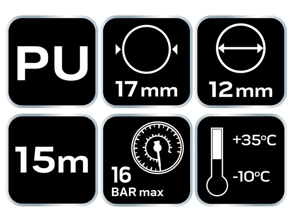 Špirálová tlaková hadica, priemer 12,0 x 17 mm, 15 m, polyuretán, prevádzkový tlak 16 barov, prevádzkový rozsah -10 °C až + 35 °C