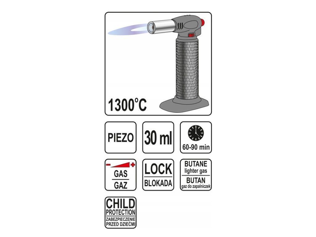 Profesionálny horák dosahuje maximálnu pracovnú teplotu až 1 300 °C. Telo je vyrobené z hliníka, s upraveným, protišmykovým povrchom. Kapacita horáka je 30 ml, čo zabezpečuje prácu na 60 až 90 minút. Horák využijete v dielni na zahrievanie rôznych prvkov. Použiteľný je pri uvoľňovaní zaistených skrutiek, vypaľovaní malých kovových alebo drevených povrchov, ohrievaní, rozmrazovaní alebo sušení. Rovnako ho použijete aj pri zmršťovaní teplom, ohýbaní alebo lepení za tepla. Využijete ho aj v domácnosti – pri rozpaľovaní krbov alebo grilov, a taktiež v kuchyni, pri flambovaní.