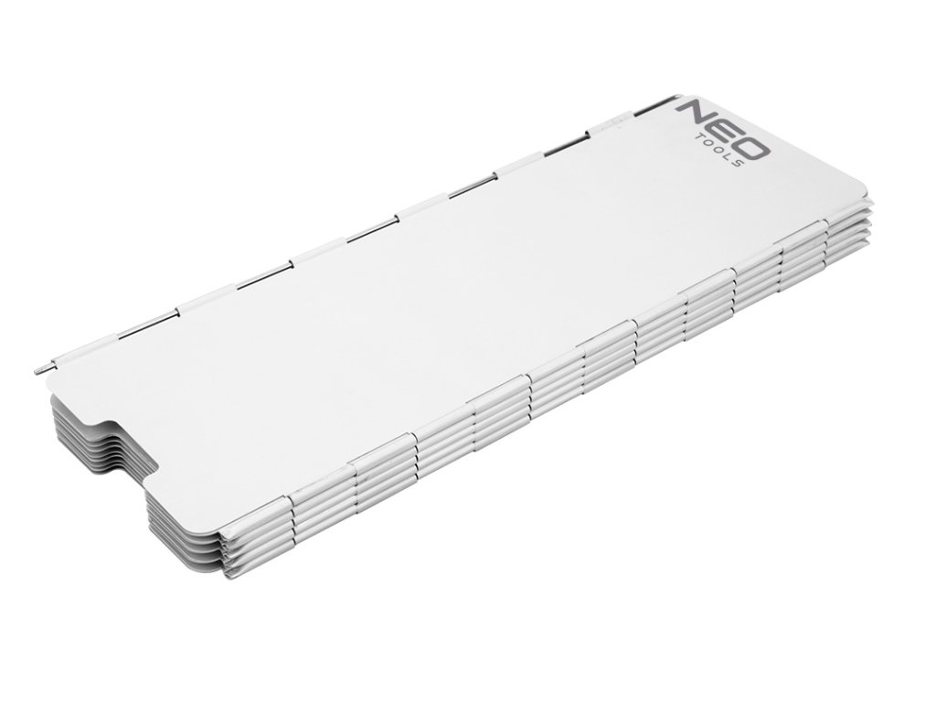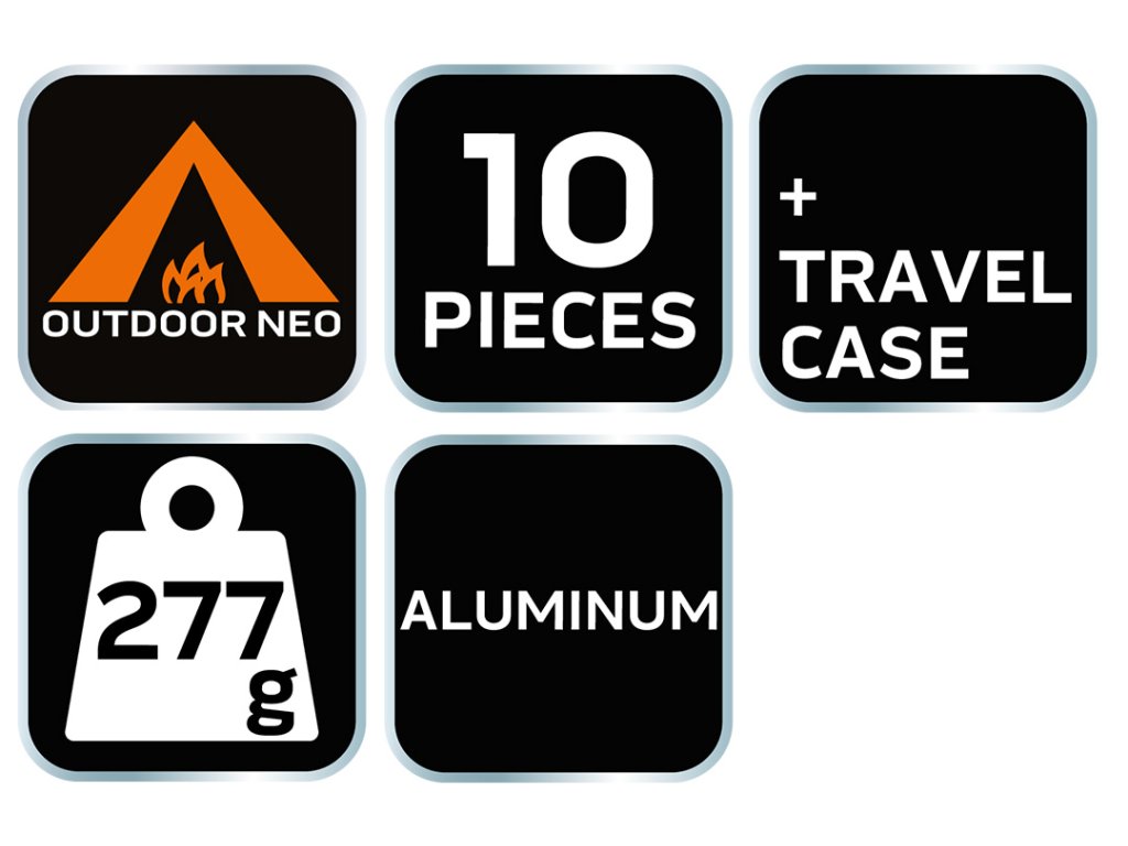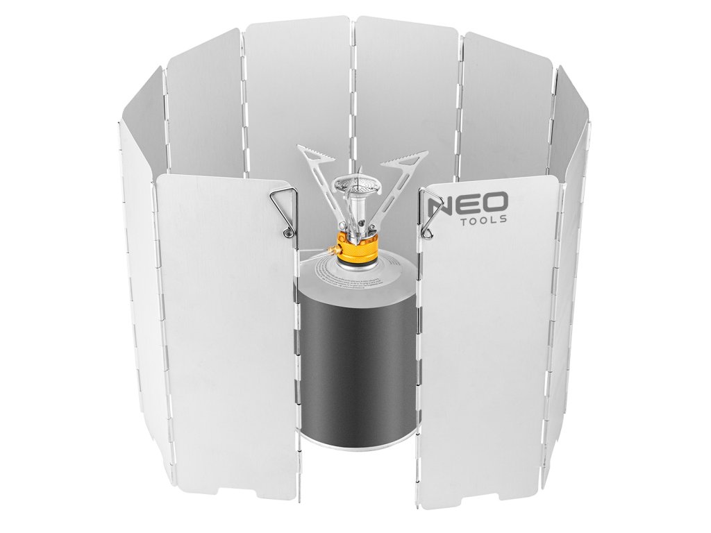 10-dielny veterný štít horáka 63-142 od spoločnosti NEO pozostáva z 10 kusov vyrobených z hliníka. Hmotnosť výrobku je 277 g. Štít je 240 mm vysoký a 840 mm široký. Ponúka sa s plastovým puzdrom na pohodlné skladovanie a prepravu prvku. Je vhodný na všetky druhy výletov mimo mesta, kempovanie a horolezectvo. Je ľahký a ľahko sa udržiava.