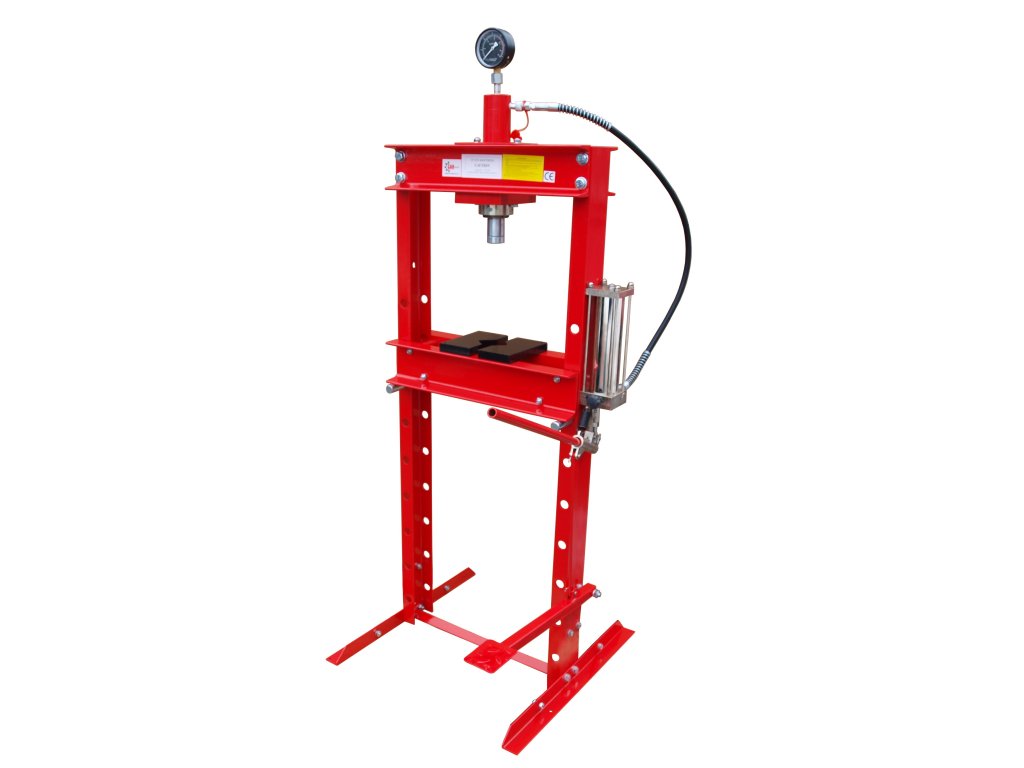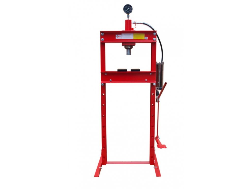 Hydraulický lis s maximálnym tlakom 20 T vybavený ručnou a nožnou pumpou pre lisovanie predmetov s manometrom.