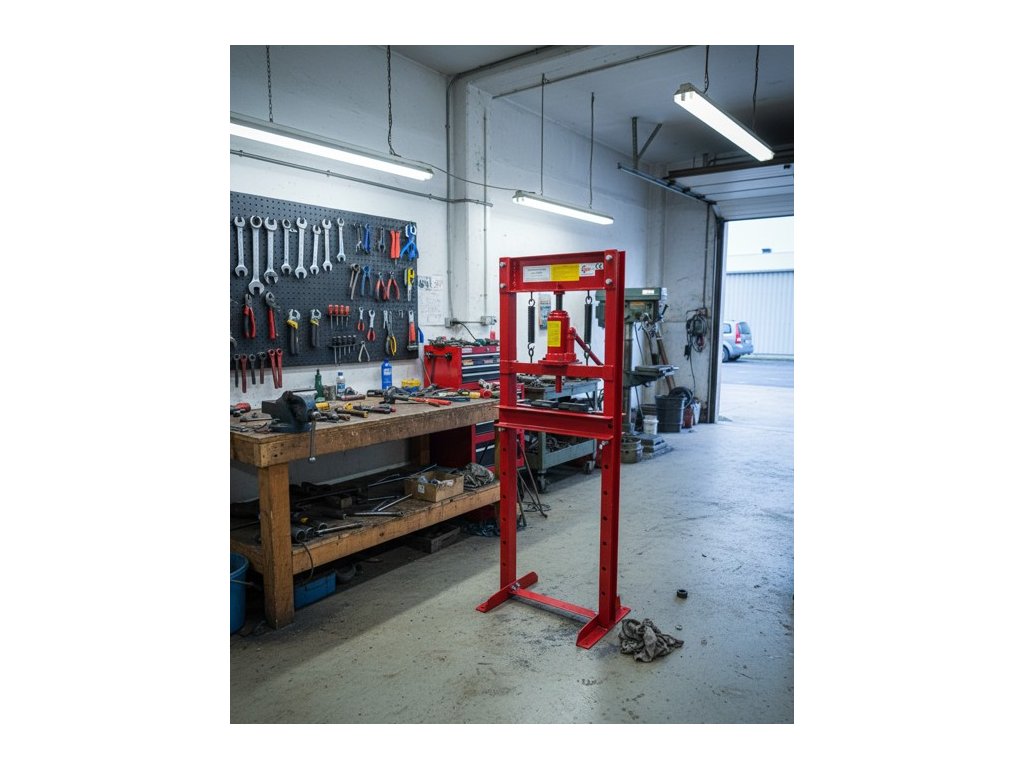 Hydraulický lis s maximálnym tlakom 12 ton vybavený ručnou pumpou pre lisovanie predmetov.