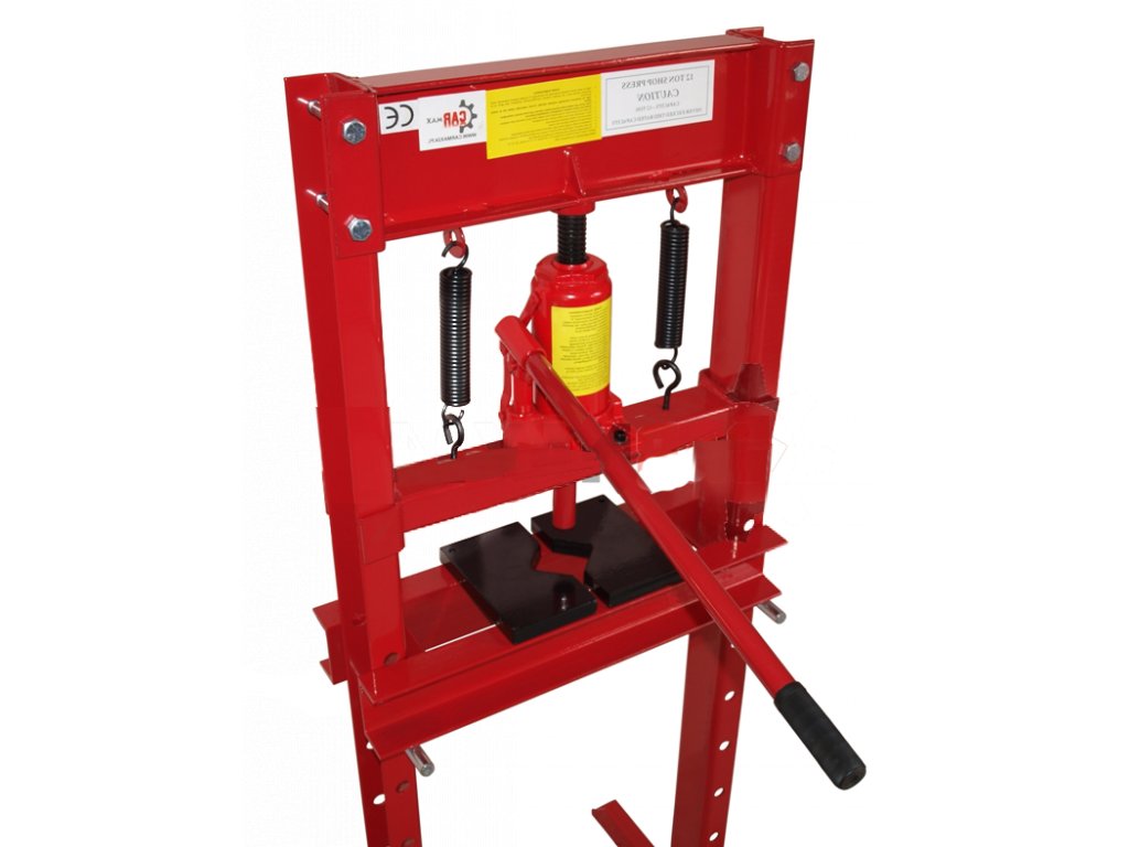 Hydraulický lis s maximálnym tlakom 12 ton vybavený ručnou pumpou pre lisovanie predmetov.