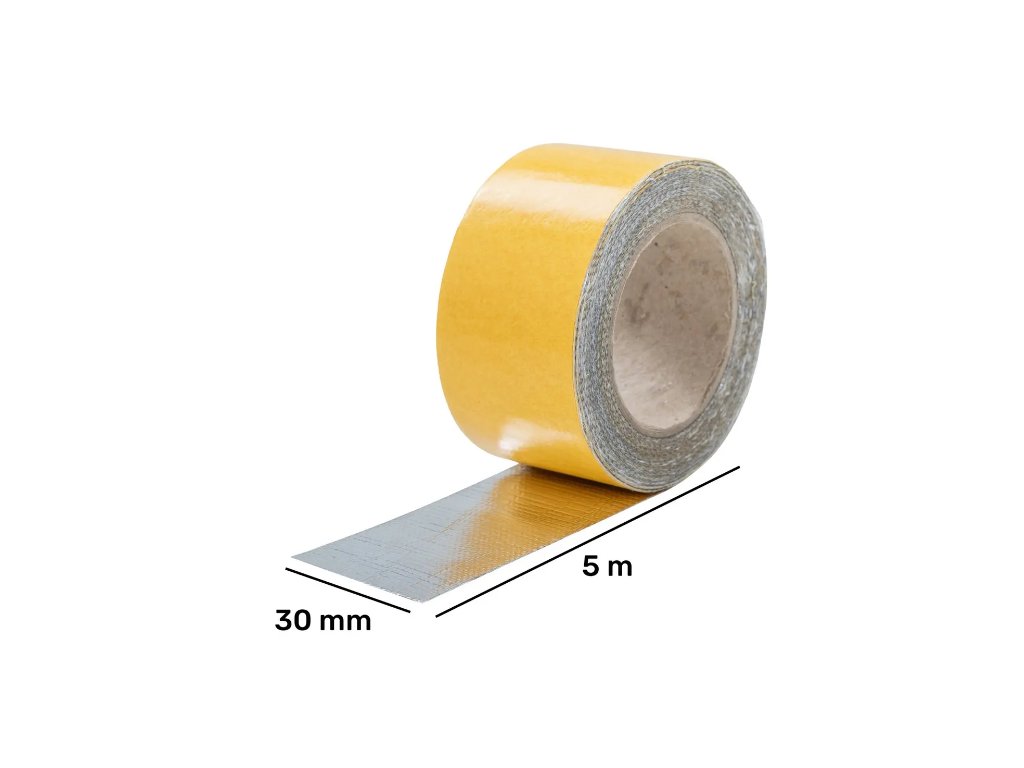 Sklotextilná hliníková páska do 600 °C, 5 m, šírka 30 mm. Samolepiaca – ideálna na väčšie prekrytia a izoláciu.