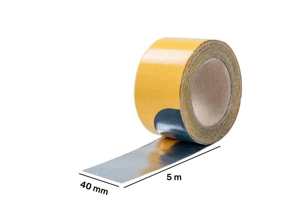 Sklotextilná hliníková páska do 600 °C, 5 m, šírka 40 mm. Samolepiaca – pre širšie prekrytie, izoláciu a ochranu.