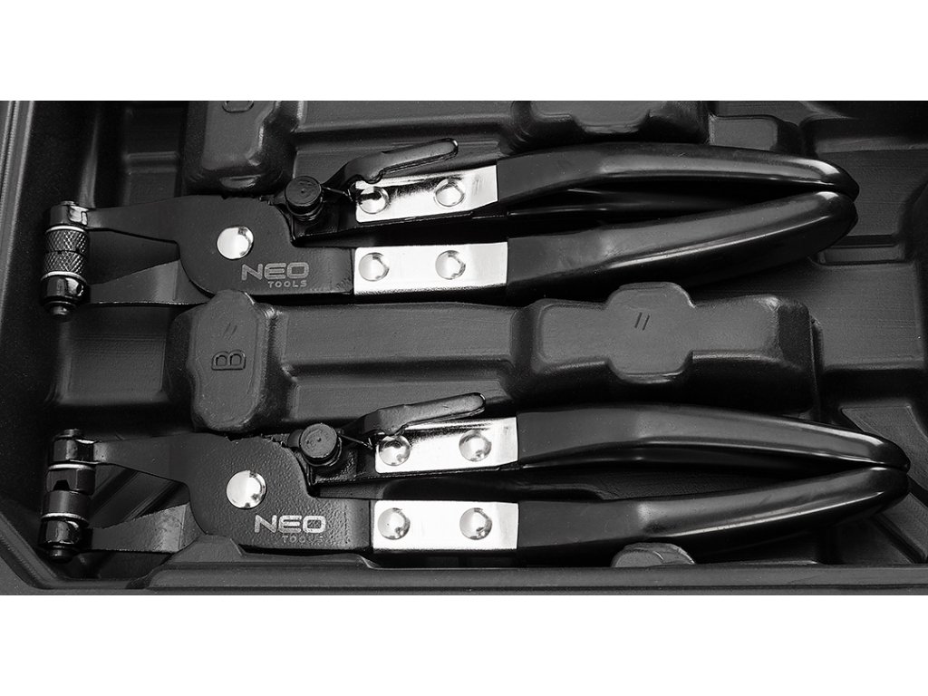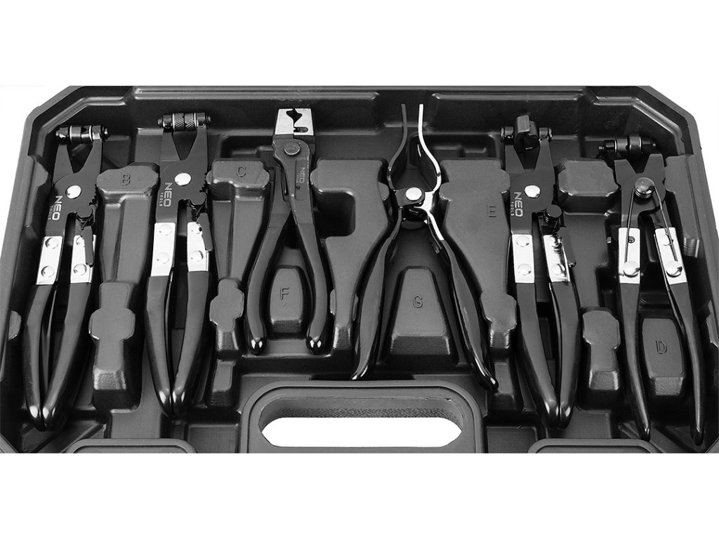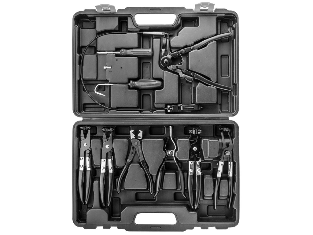 Káblové kliešte na hadicové spony. Sada obsahuje 9 kusov klieští, balené v praktickom kufri.
