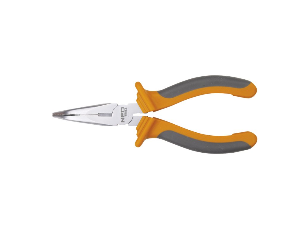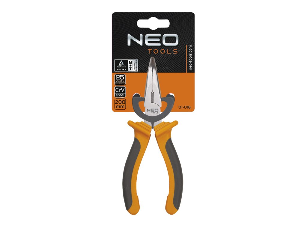 Podlhovasté ohnuté kliešte NEO (ref. 01-016) s veľkosťou 200 mm, vyrobené podľa DIN5745. Indukčne kalené čeľuste ohnuté pod uhlom 45° (55-60 HRC) poskytujú pevné uchopenie a účinné rezanie. Ergonomická rukoväť z dvoch materiálov pre väčšie pohodlie. Kvalitu nástroja potvrdzuje certifikát TÜV a 25-ročná záruka výrobcu. Značka NEO spĺňa očakávania profesionálov.