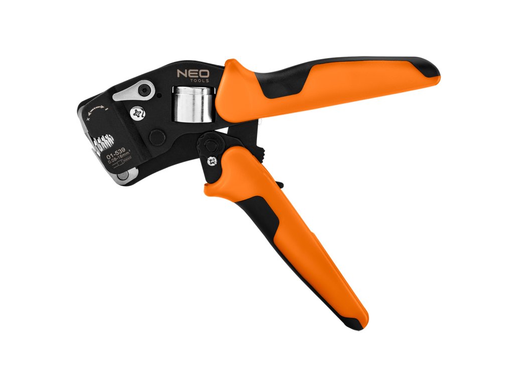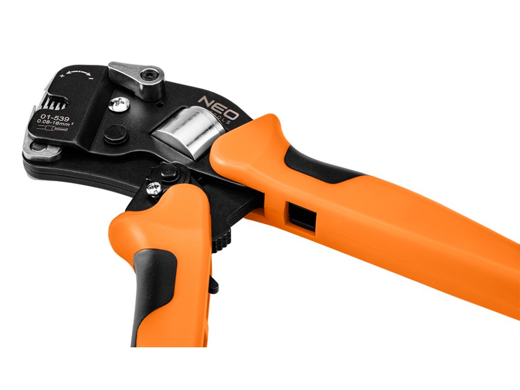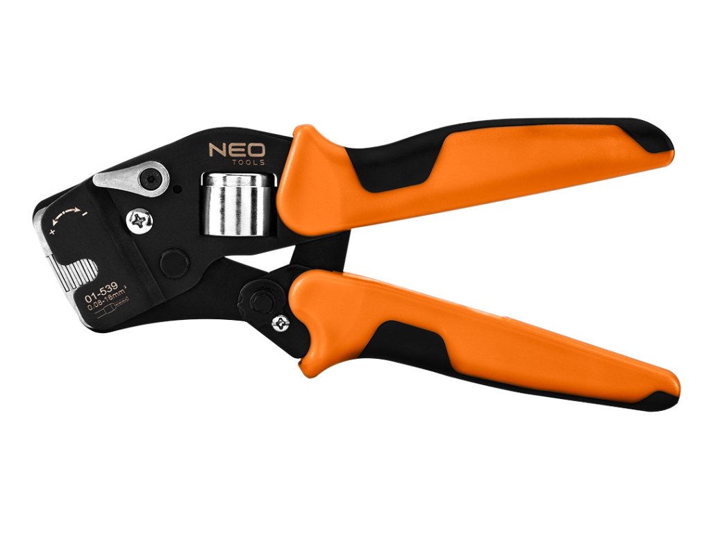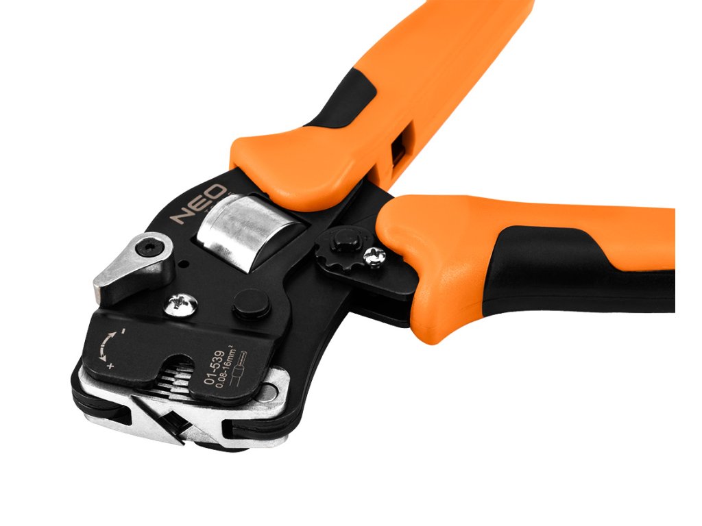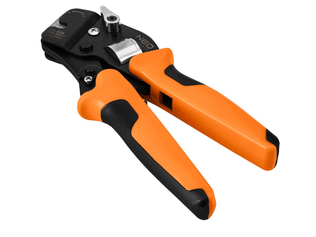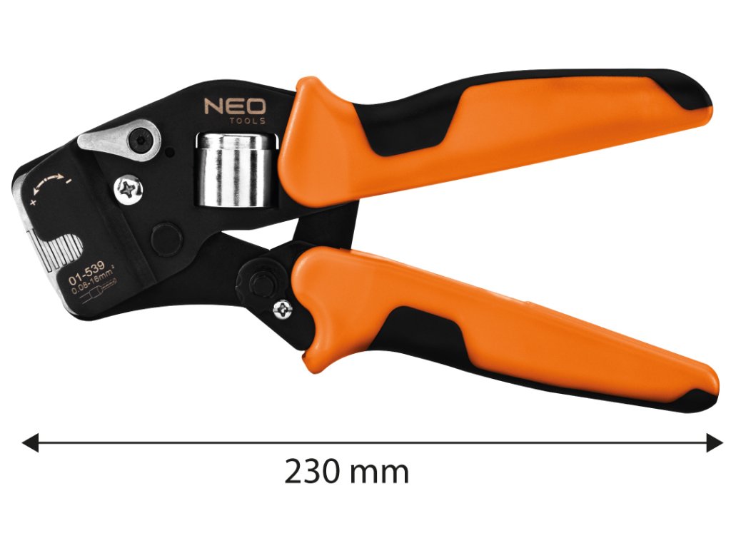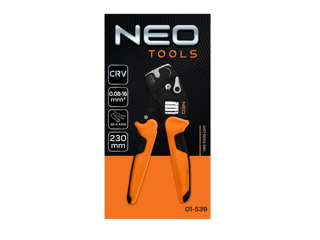 CRV 230 mm, samonastaviteľné 0,08 -16 mm2, AWG 26-5, 01-539 koncové krimpovacie kliešte od spoločnosti NEO sú 230 mm dlhé oceľové kliešte CRV. Vybavené samonastavovacími čeľusťami 0,08-16 mm2. Kompatibilný s AWG 26-5, malými a veľkými konektormi (vďaka zabudovanej prevodovke). Krimpovacie zariadenie má manuálny prevod veľkosti, štvorcové krimpovanie a nastavenie tlaku krimpovania. Má možnosť čelného vloženia kábla. Nástroj je vybavený dvojzložkovou rukoväťou TPR+ABS a ergonomickou rukoväťou. Jeho hmotnosť je 0,5 kg. Kliešte značky NEO sa odporúčajú elektrikárom na profesionálne účely.