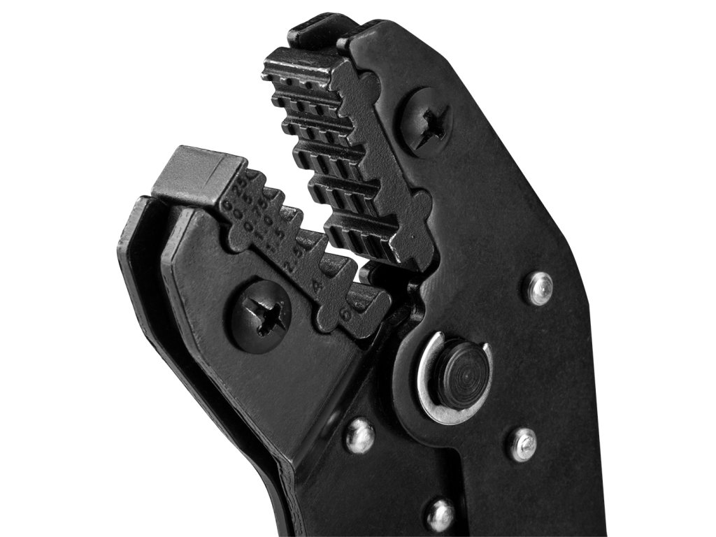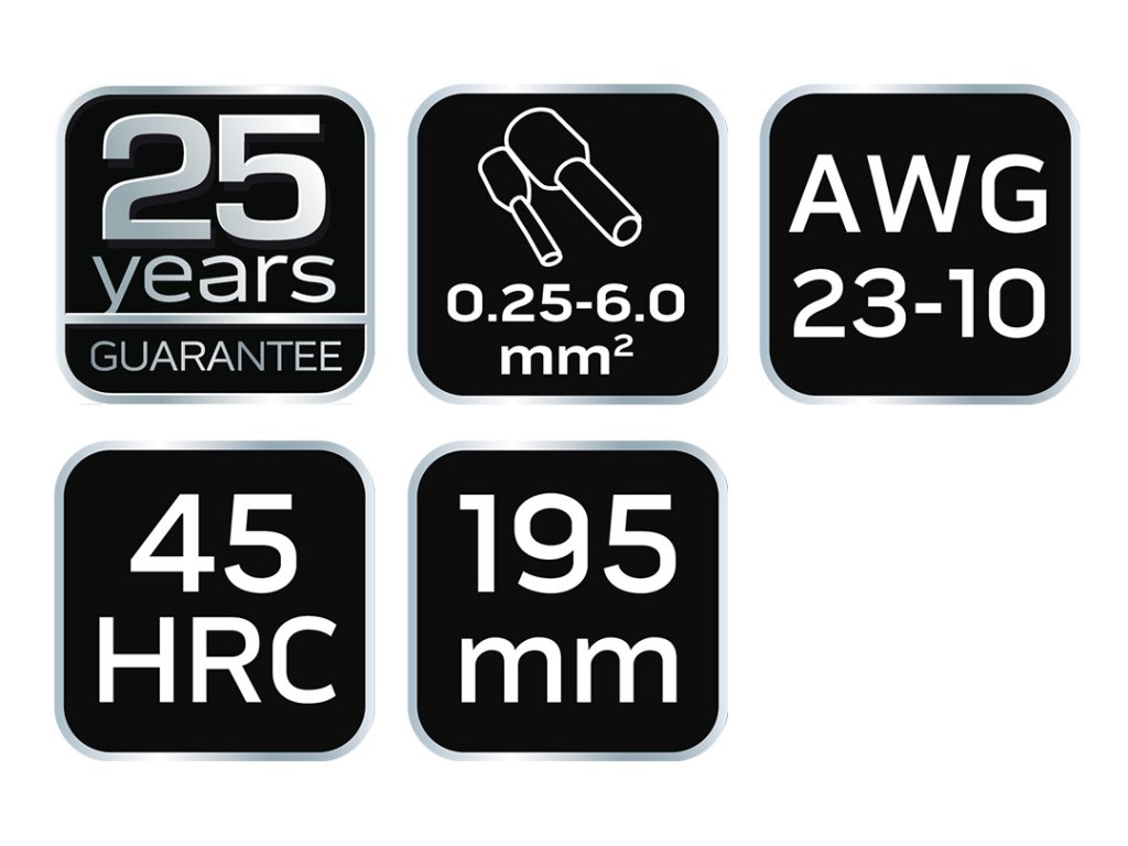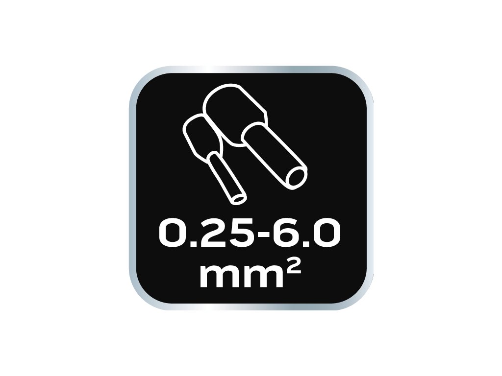 Krimpovacie kliešte na koncovky, dĺžka 195 mm, rozsah 0,25-6,0 mm, materiál uhlíková oceľ, tvrdosť 45 HRC, leštený povrch, jednozložková rukoväť, na koncovky, račňový systém
