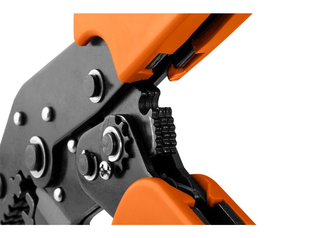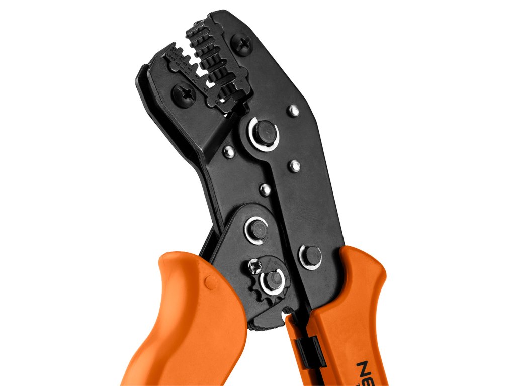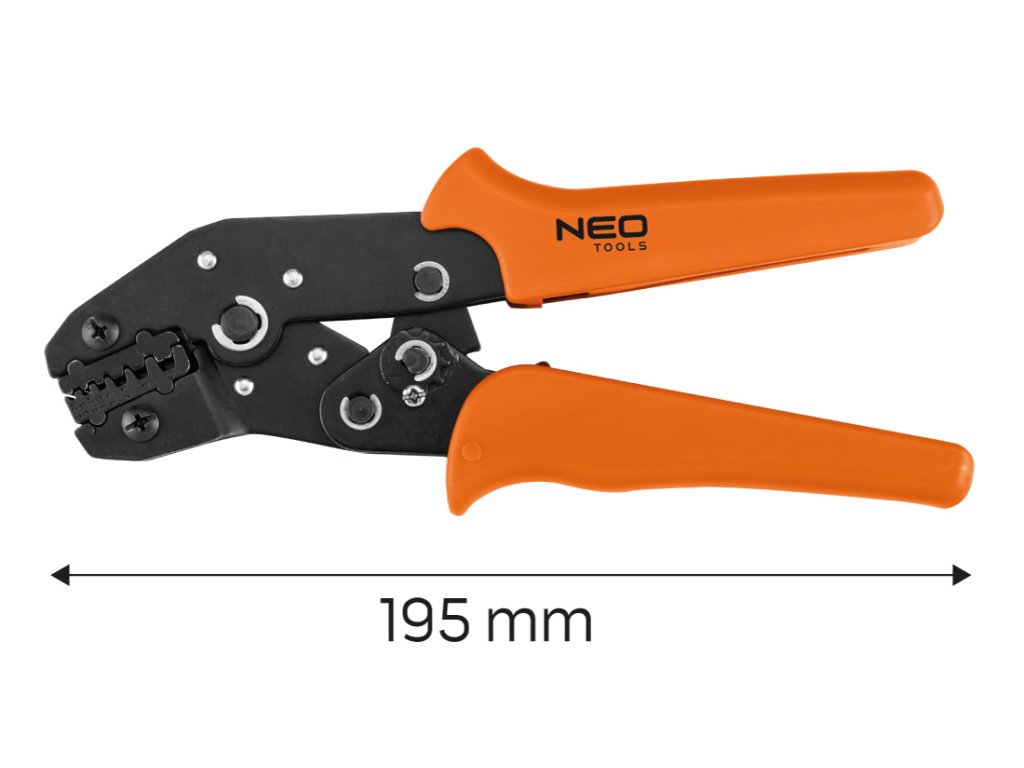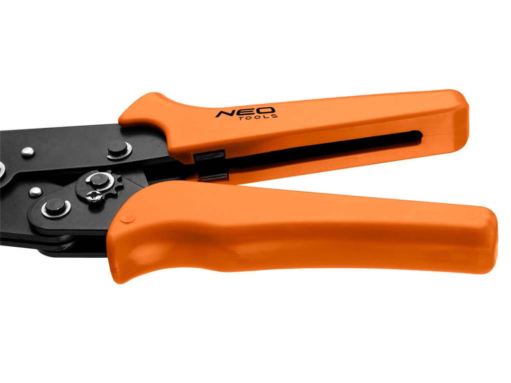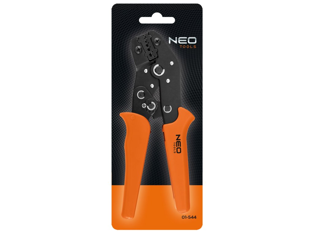 Krimpovacie kliešte s koncovkou 0,25 - 6 mm2, 01-544 od spoločnosti NEO sú ľahko použiteľným nástrojom na krimpovanie elektrických konektorov na kábloch. Dĺžka klieští je 195 mm a rozsah čeľustí je od 0,25 do 6 mm. Hlava nástroja je vyrobená z odolnej uhlíkovej ocele s tvrdosťou 45 HRC. Používanie klieští uľahčuje račňový systém. Čiernený povrch zaisťuje primeranú odolnosť. Kliešte sú vybavené jednozložkovou a ergonomickou rukoväťou. Značka NEO sa odporúča pre profesionálov.
