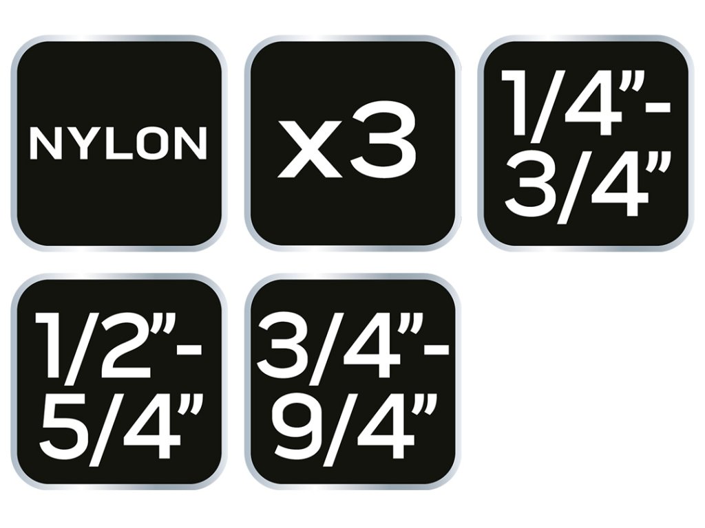 Plastové lisovacie kliešte 3 ks. rozsah 1: 1/4" - 3/4", rozsah 2: 1/2" - 5/4", rozsah 3: 3/4" - 9/4"