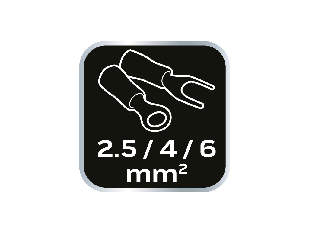 Kliešte na lisovanie konektorov MC4 s prierezmi 2.5, 4.5 i 6.0 mm2, račňový mechanizmus, nastaviteľný držiak kolíkov, materiál rukoväte PVC, torxový kľúč