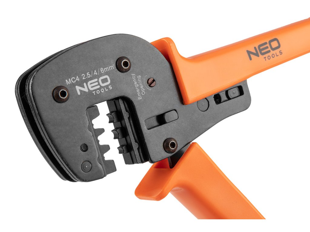 Kliešte na lisovanie konektorov MC4 NEO (ref. 01-555) sú nepostrádateľným nástrojom pri montáži fotovoltaických panelov. Je vhodný na lisovanie rovných a šikmých konektorov typu BNC, F, IEC a RCA s možnosťou nastavenia. Presný račňový mechanizmus umožňuje presné lisovanie svoriek. Predĺžené ramená umožňujú voľne zvýšiť upínaciu silu, a tým aj životnosť konektora. Sada obsahuje vymeniteľný, nastaviteľný držiak kolíkov so šesťhranným kľúčom.