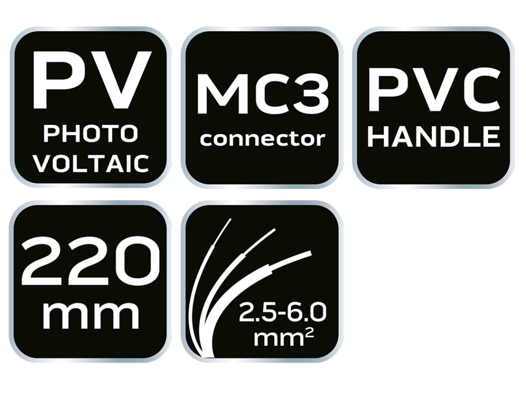 Kliešte na lisovanie fotovoltaických konektorov MC3, rukoväť PVC, uhlíková oceľ, dĺžka 220 mm, priemery káblov 2,5 mm2 - 6 mm2