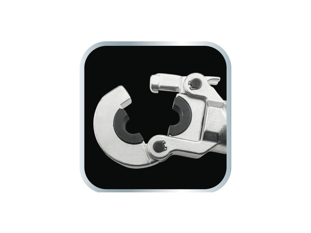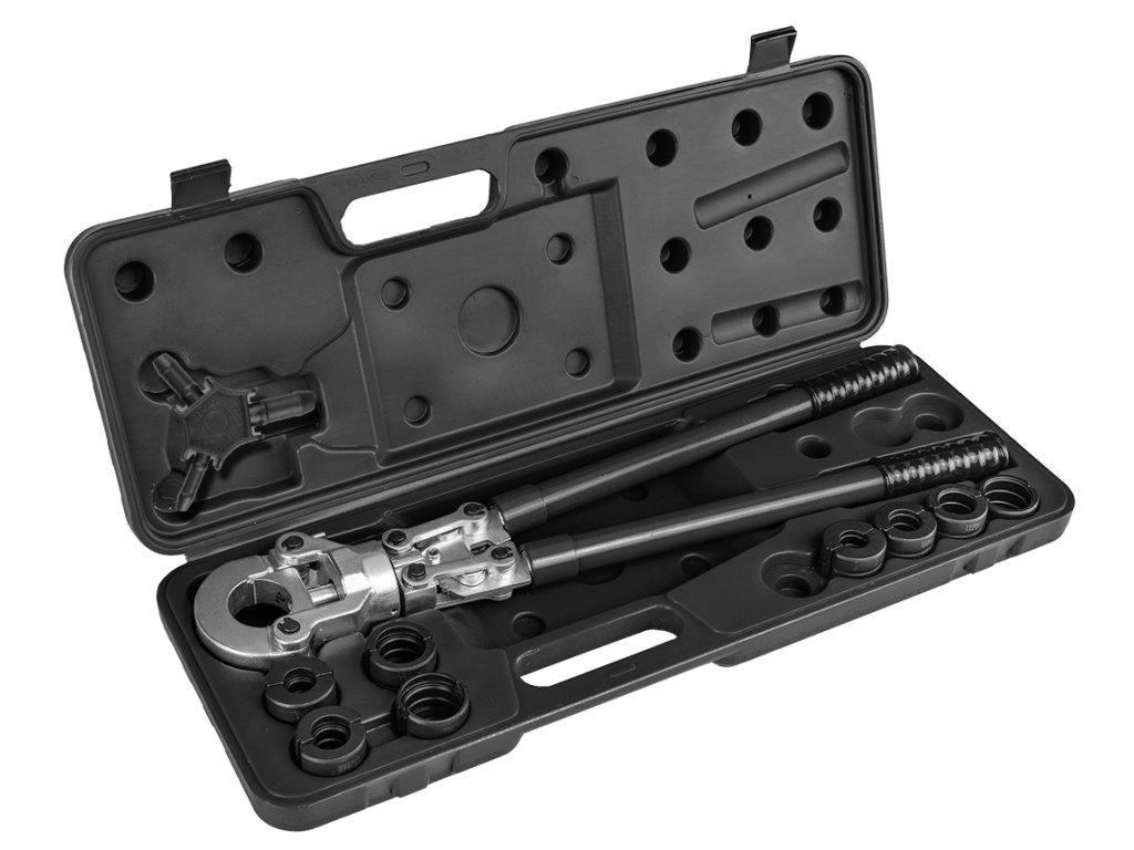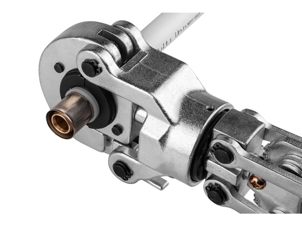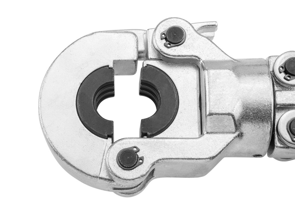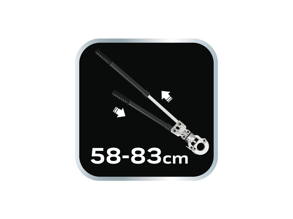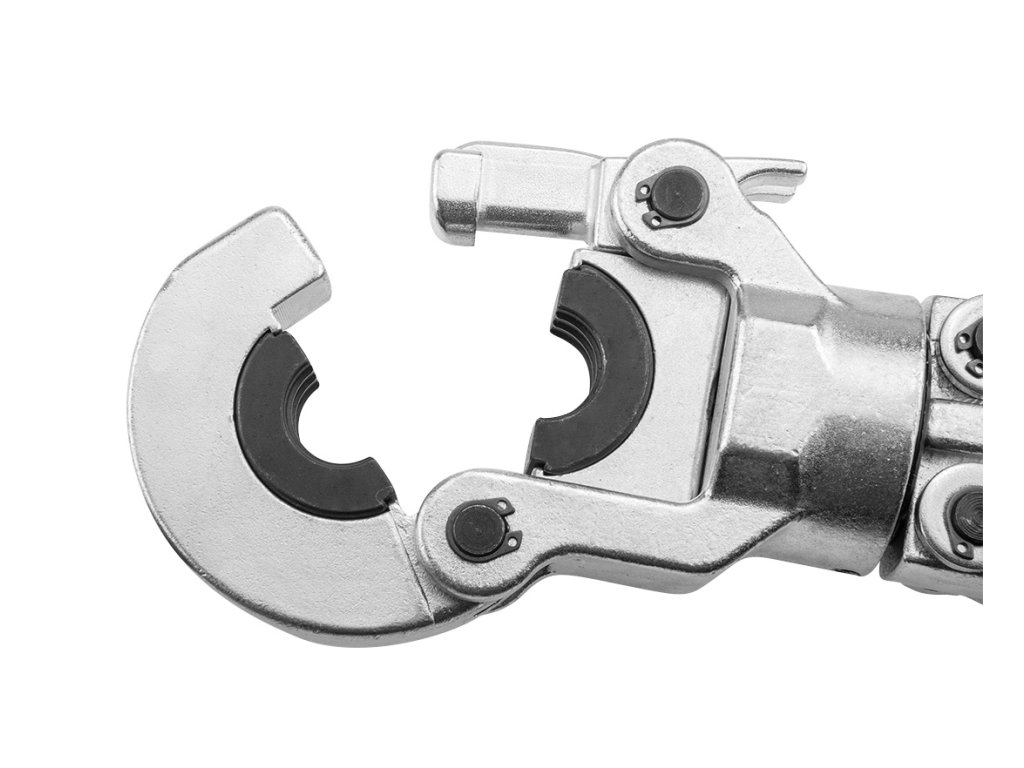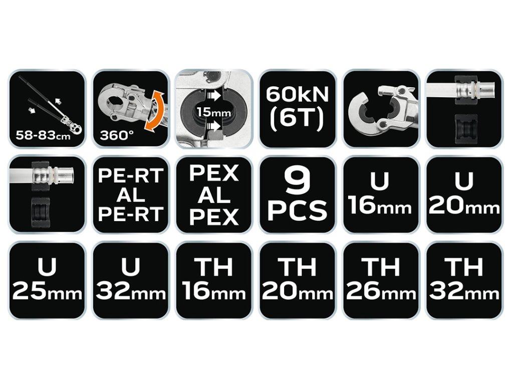 Lis na krimpovanie PEX konektorov teleskopický rozsah uchopenia 58-83 cm, 360° otočná hlava, výkon 60 kN, kufrík na prenášanie, matrice typu U: 16 mm / 20 mm / 25 mm / 32 mm, matrice typu TH: 16 mm / 20 mm / 26 mm / 32 mm, hmotnosť 4,26 kg, mäkká rukoväť, kalibrátor rúr 16 20 25 mm s odihľovačom v telese v kufri