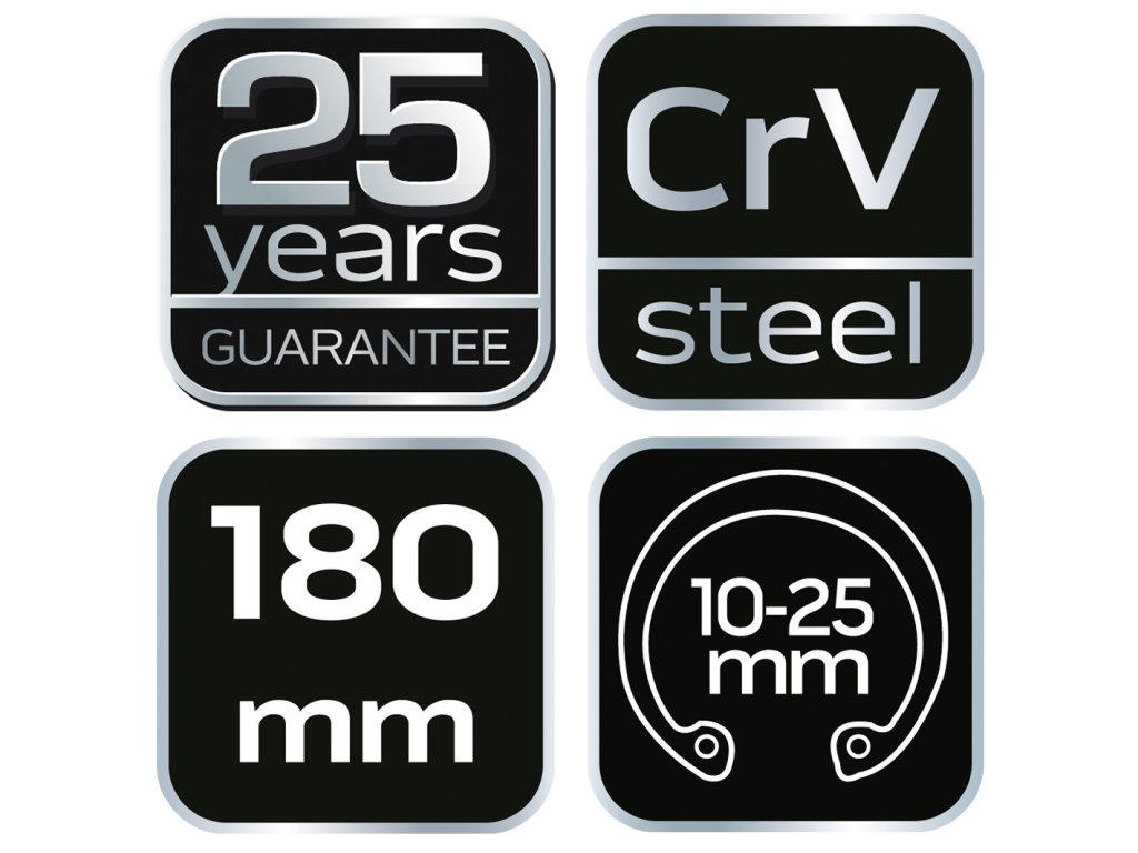SEGERA NEO kliešte na poistné krúžky (ref. 01-043) vnútorné, rovné, veľkosť 180 mm. Pre krúžky 10-25 mm, priemer hrotu 1,7 mm. Vysokokvalitná chróm-vanádiová oceľ zaručuje dlhodobú odolnosť klieští. Rukoväte s protišmykovým povrchom sa dobre držia v ruke a umožňujú pevné uchopenie. Kvalita náradia potvrdená certifikátom TÜV a 25-ročnou zárukou výrobcu. Značka NEO spĺňa očakávania profesionálov.