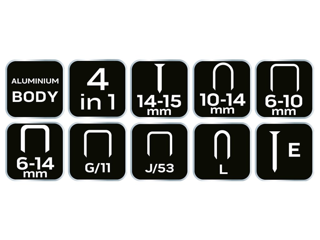Multifunkčná zošívačka 4 v 1, 6-14 mm, hliník, sponky J, G, L, E 16-030