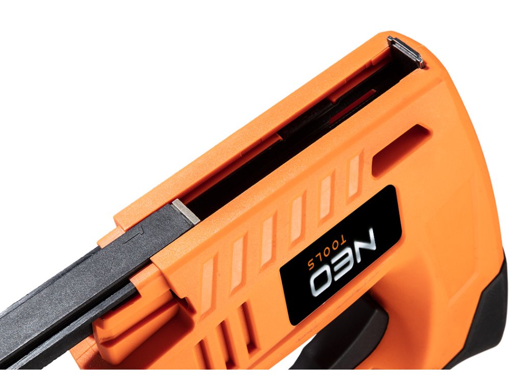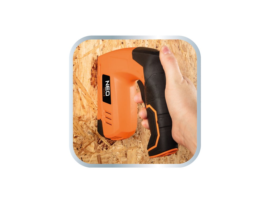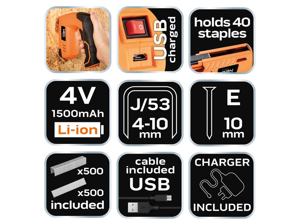4V, USB napájaná zošívačka na čalúnenie 16-050 od spoločnosti NEO je zošívačka napájaná 4V lítium-iónovou batériou 18650 s kapacitou 1500 mAh a nabíjaná pomocou kábla USB (micro USB), ktorý je súčasťou súpravy. Čas plného nabíjania je 5 h. Rýchlosť zošívačky je 40 zošívačiek za minútu. Je kompatibilný so sponkami J/53 s dĺžkou 4 až 10 mm a klincami E s maximálnou dĺžkou 10 mm. Kapacita zásobníka je 40 kusov. V súprave sa nachádza aj batéria a po 500 sponiek a klincov. Nástroj je certifikovaný CE.