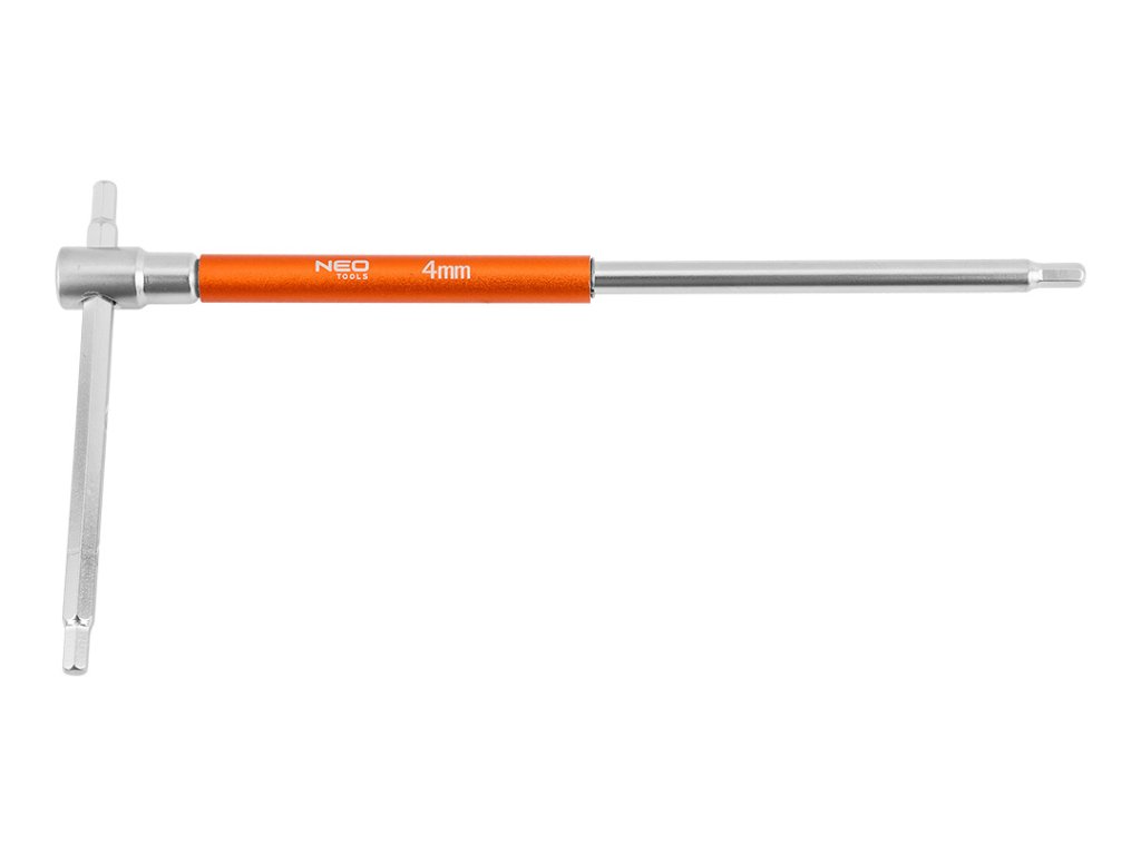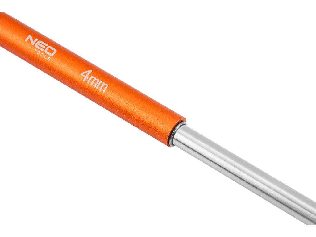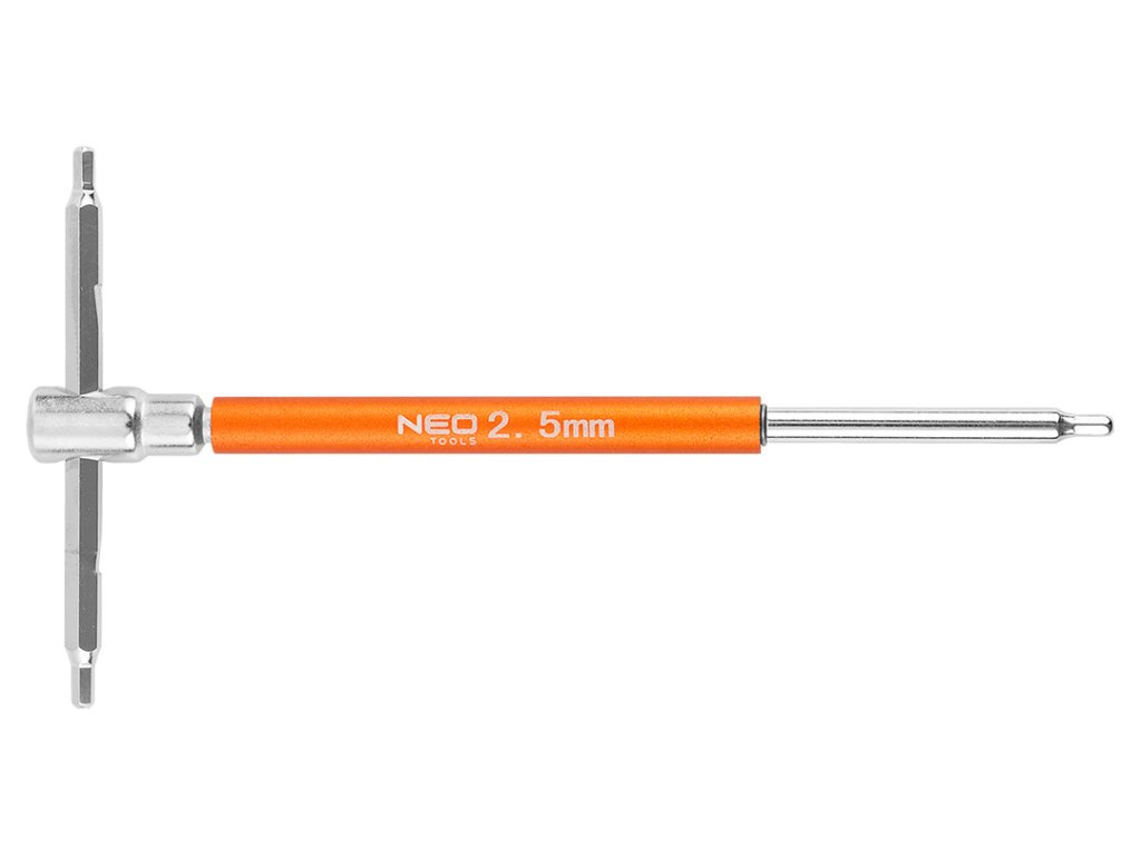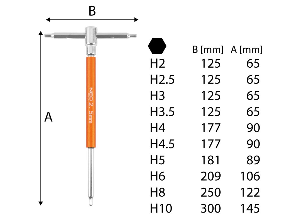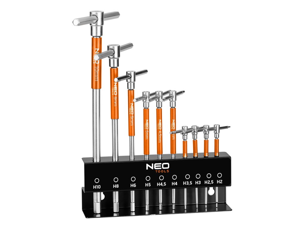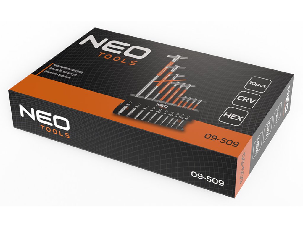 Kľúče HEX. Sada 10 kusov v stojane 2 - 10 mm 09-509 od NEO TOOLS je sada pozostávajúca z HEX (šesťhranných) kľúčov v 10 rôznych veľkostiach a praktického závesného stojana s rozmermi 220 x 40 x 82 mm (rozstup závesných otvorov - 175 mm). Kľúče sú vyrobené z odolnej kovovej zliatiny CRV. Ponúkajú sa vo veľkostiach: H2 (125 x 65 mm), H2,5 (125 x 65 mm), H3 (125 x 65 mm), H3,5 (125 x 65 mm), H4 (177 x 90 mm), H4,5 (177 x 90 mm), H5 (181 x 89 mm), H6 (209 x 106 mm), H8,(250 x 122 mm), H10 (300 x 145 mm). Vďaka svojej dĺžke a rozmanitosti umožňujú prístup k hlbším skrutkám. Sada NEO TOOLS ponúka aj dve možnosti použitia: dlhšiu časť možno použiť ako kľučku, zatiaľ čo závitovka má hroty typu HEX vo zvolenej veľkosti. Kľúče sa osvedčia všade tam, kde sa používajú kľúče typu HEX (imbusové), napr. na odskrutkovanie skrutiek, nastavovanie, napr. v opravovniach bicyklov alebo pri montážnych prácach. Vďaka priloženému stojanu ich ľahko udržíte v poriadku a na dosah.