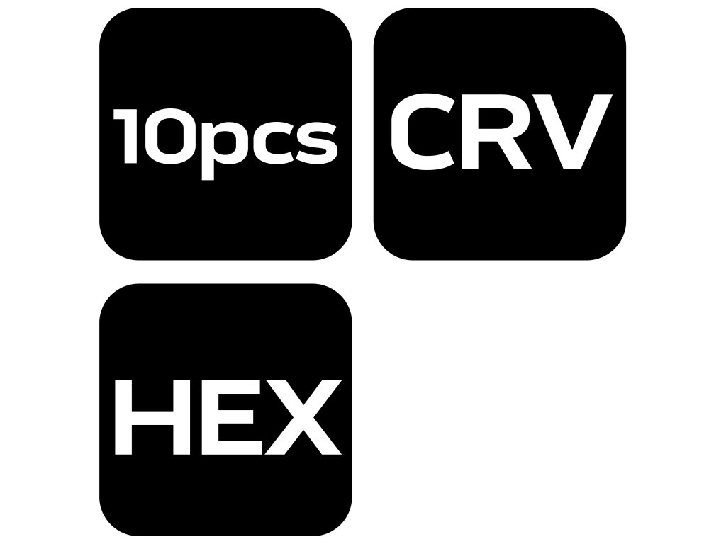 Kombinované kľúče so stopkou, sada 10 kusov. v kovovom stojane s možnosťou zavesenia); veľkosti: H2 (125 x 65 mm), H2,5 (125 x 65 mm), H3 (125 x 65 mm), H3,5 (125 x 65 mm), H4 (177 x 90 mm), H4,5 (177 x 90 mm), H5 (181 x 89 mm), H6 (209 x 106 mm), H8,(250 x 122 mm), H10 (300 x 145 mm); stojan: 175 mm; CRV