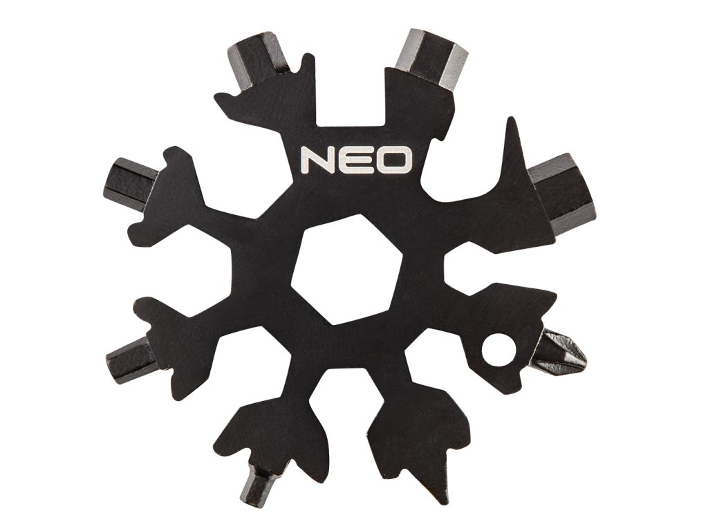 NEO Snowflake 19-in-1 Multi-Tool je súprava dvoch nástrojov v tvare snehovej vločky v čiernej a bielej farbe.