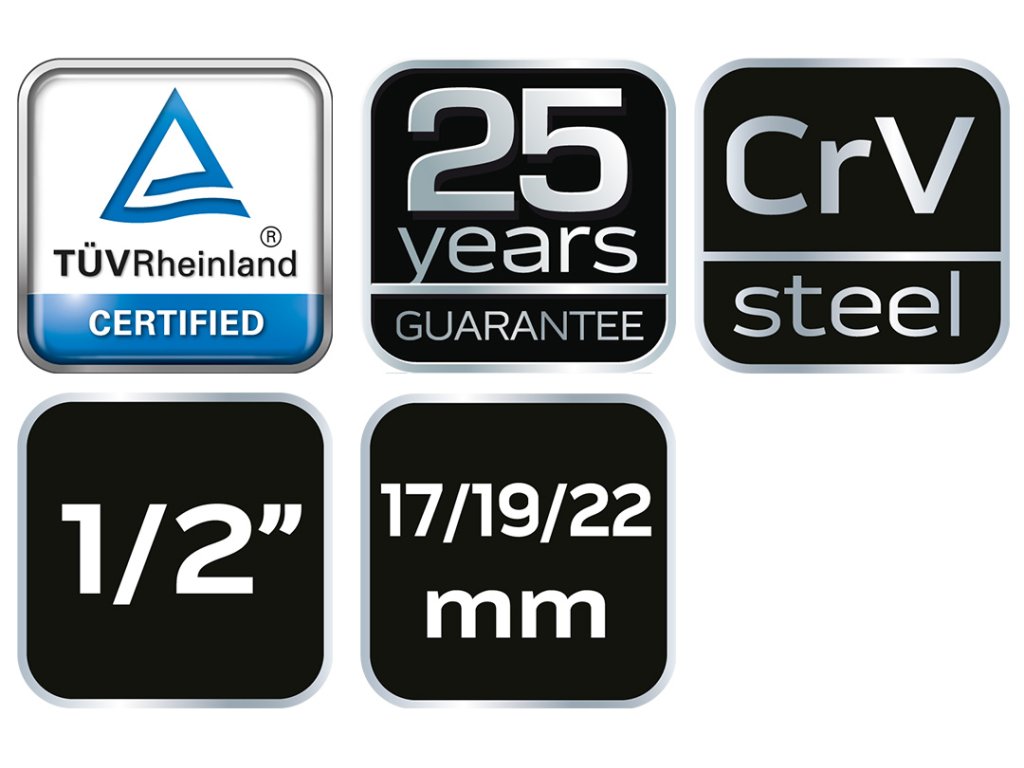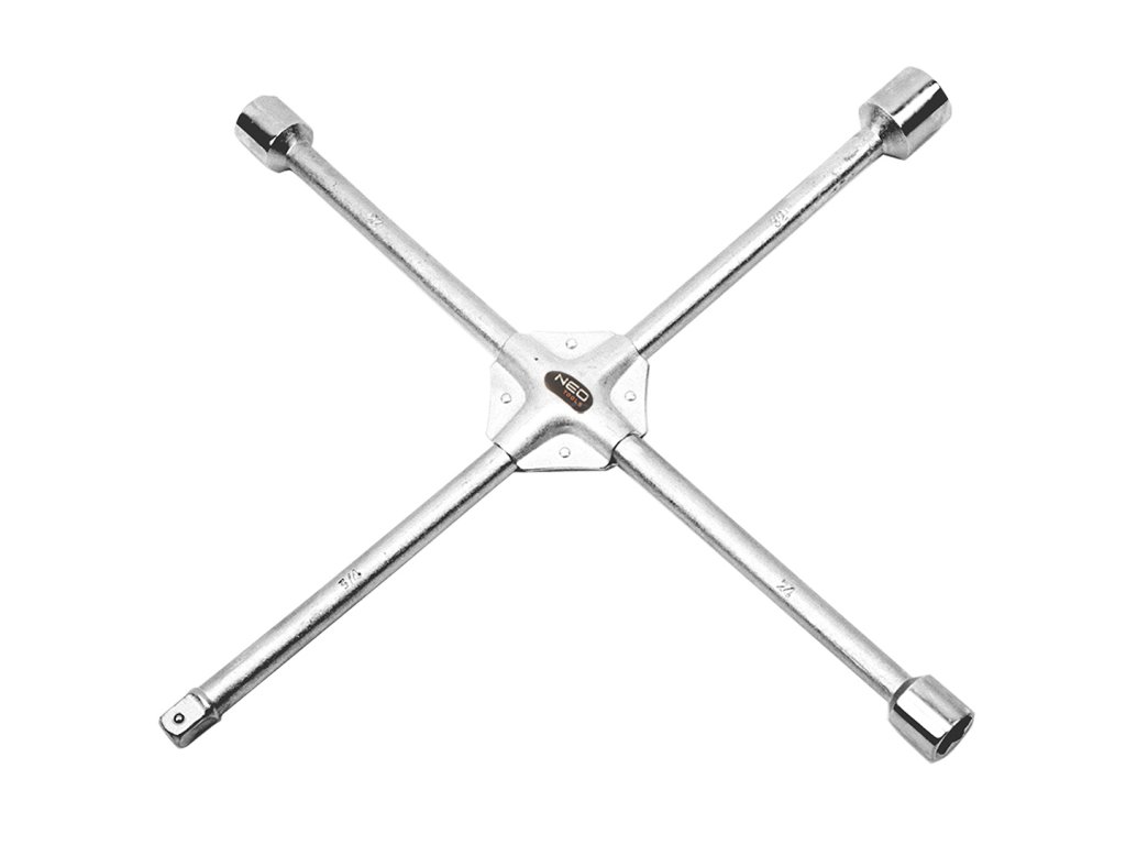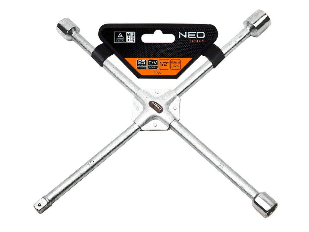 Krížový kľúč na kolesá 17 x 19 x 22 x 1/2" mm 11-100 od spoločnosti NEO s rozmermi 17 x 19 x 22 x 1/2" mm a dĺžkou 380 mm je vyrobený z robustnej chróm-vanádiovej ocele. Má normu DIN889 a certifikát TÜV M+T. Ide o náradie so zosilnenou konštrukciou určené na odskrutkovanie a dotiahnutie kolies vozidiel. Má niekoľko veľkostí v jednom kľúči, vďaka čomu je univerzálnejší. Vyznačuje sa praktickosťou a vysokou kvalitou. Odporúča sa všetkým používateľom motorových vozidiel.