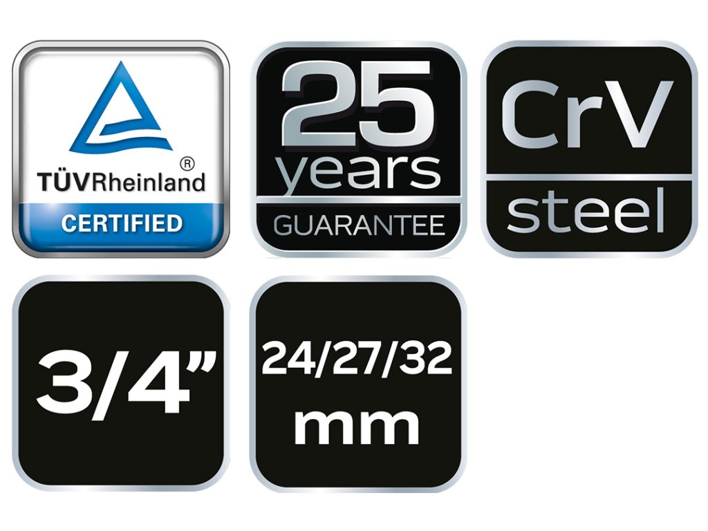 Kľúč na kolesá, 24 x 27 x 32 mm, 3/4" 11-102 od spoločnosti NEO je nástroj na uvoľňovanie a uťahovanie kolies, ktorý sa vyznačuje niekoľkými veľkosťami v jednom kľúči (24 x 27 x 32 mm). Má 3/4" nástavec. Jeho dĺžka je 700 mm, čo výrazne ovplyvňuje komfort používania. Kľúč NEO je vyrobený z kvalitnej CrV ocele. Je v súlade s certifikátom TÜV M+T. Jeho robustná konštrukcia a praktický tvar z neho robia ideálne náradie pre každého používateľa motorového vozidla.
