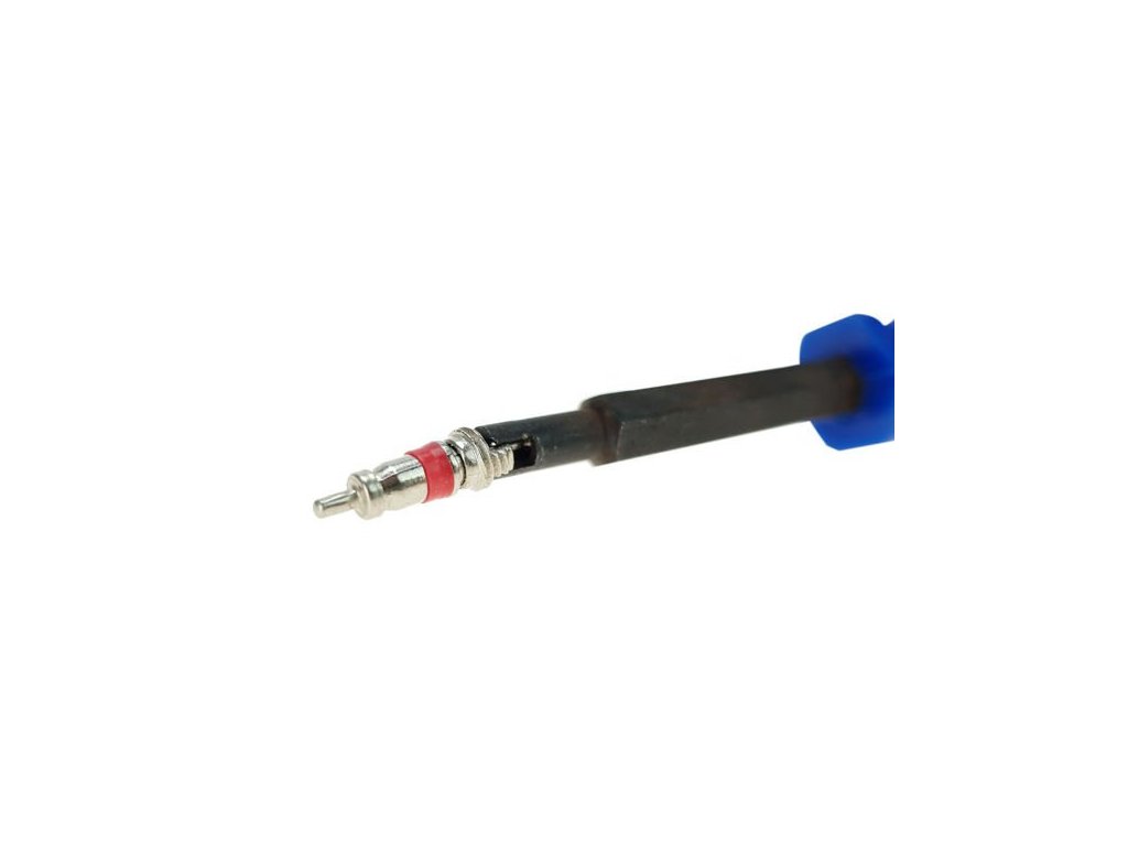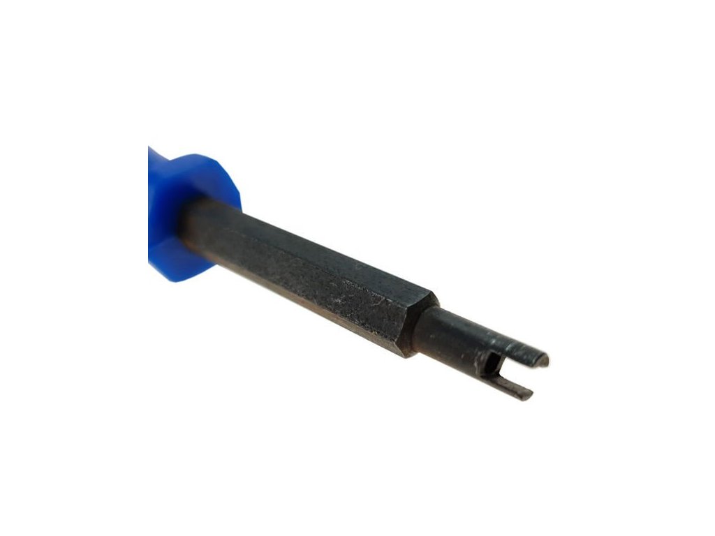 Kľúč pre vložky každého štandardného ventilu. Plastová rukoväť je pohodlná pre ruku. Kľúč je ošetrený oxidačnou vrstvou, ktorá zabráni hrdzaveniu. Demontáž pružinovej vložky z ventilov je potrebná pri fúkaní pneumatiky. Po montáži kolesa pred nafúknutím odskrutkujte pružinovú vložku, aby sa uľahčilo tlakovanie a aby nedošlo k poškodeniu vložky impulzom stlačeného vzduchu. Vložka sa po dosiahnutí požadovaného tlaku v kolese zaskrutkuje späť do ventilu a tlak sa vyrovná s pištoľou s tlakomerom.
