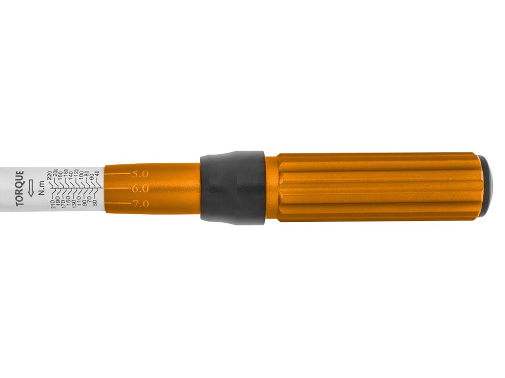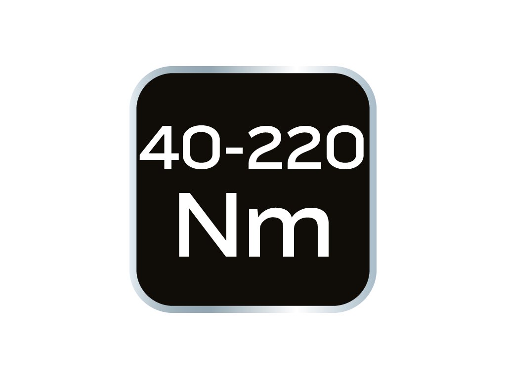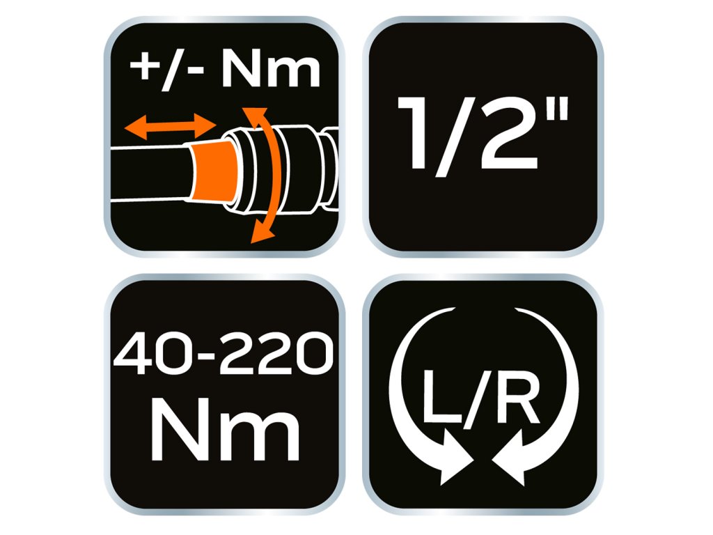 1/2 palcový x 510 mm reverzibilný momentový kľúč, 40- 220 Nm, automatická aretácia, rohatka so 72 zubami, zaisťovací krúžok, presnosť +/- 3% pre pravé závity a +/- 6% pre ľavé závity, neskladovať kľúč s pružinou nastavený na maximálne hodnoty, kalibračný certifikát, oceľ CrV, obal, kufor