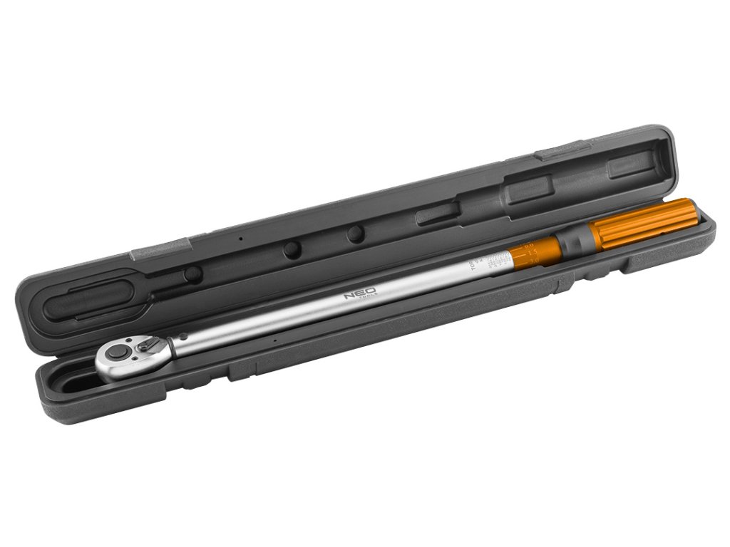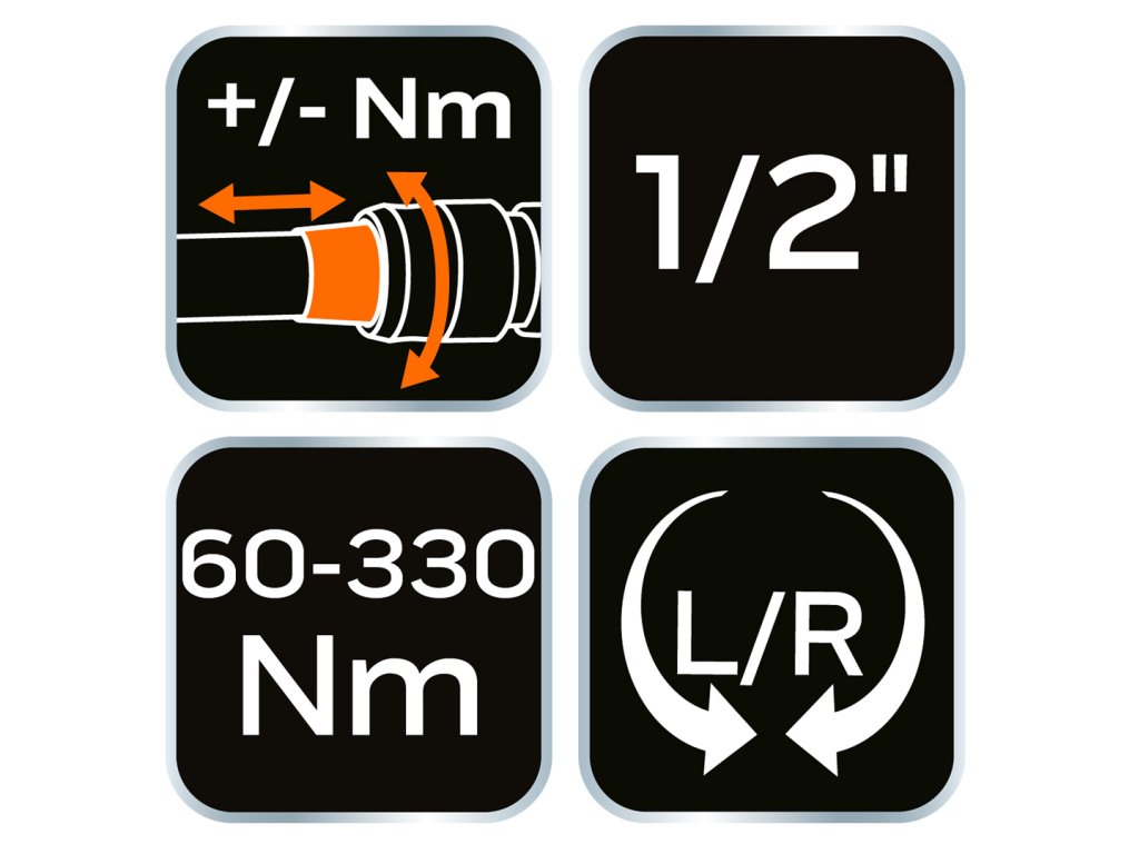 Obojsmerný momentový kľúč 1/2 "x 570 mm, 60-330 Nm, automatická aretácia, ráčna so 72 zubami, poistný krúžok, presnosť +/- 3% pre pravé závity a +/- 6% pre ľavotočivé závity, neuchovávajte kľúč s pružinou nastavenou na maximálne hodnoty, kalibračný list, oceľ CrV, obal, kufor
