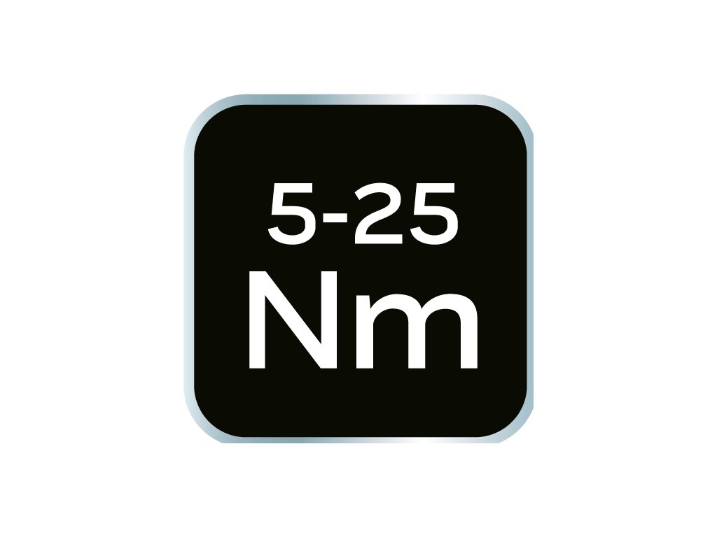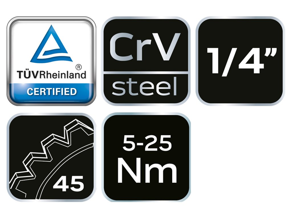 Momentový kľúč 1/4", rozsah 5-25NM, dĺžka: 25 cm, kovová konštrukcia, rúrka z legovanej ocele, presnosť +/-4 % od 20 % do 100 % maximálneho krútiaceho momentu, aretácia push-pull, kľúč sa nesmie skladovať s pružinou nastavenou na maximálne hodnoty, kalibračný certifikát, CrV oceľ, plastový kufrík
