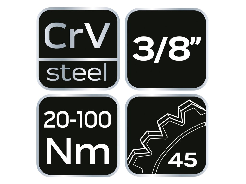 Momentový kľúč 3/8" x 470 mm, 20-100 Nm, s račňovým mechanizmom so 45 zubami, poistný krúžok, okienko so stupnicou, kľúč sa nesmie skladovať s pružinou nastavenou na maximálne hodnoty, kalibračný certifikát, CrV oceľ, plastové vrecko