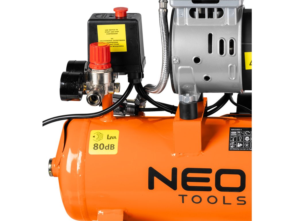 12-litrový bezolejový kompresor 12K020-1 od spoločnosti NEO TOOLS je bezolejový kompresor s objemom 12 litrov, maximálnym tlakom 8 barov a výkonom 550 W. Vyžaduje napájanie 230 V/50 Hz. Vyznačuje sa prívodom vzduchu 95 l/min a hlučnosťou 65 dB. Bezolejový kompresor od spoločnosti NEO TOOLS má výkonný indukčný motor a guľový vypúšťací ventil. Odporúča sa do profesionálnych dielní, kde je veľmi dôležitý ľahký prístup ku konektorom, regulácia tlaku a manometre, ako aj možnosť pracovať so širokou škálou pneumatického náradia - je veľmi dôležitý. Vďaka pohodlnej rukoväti sa ľahko prenáša.