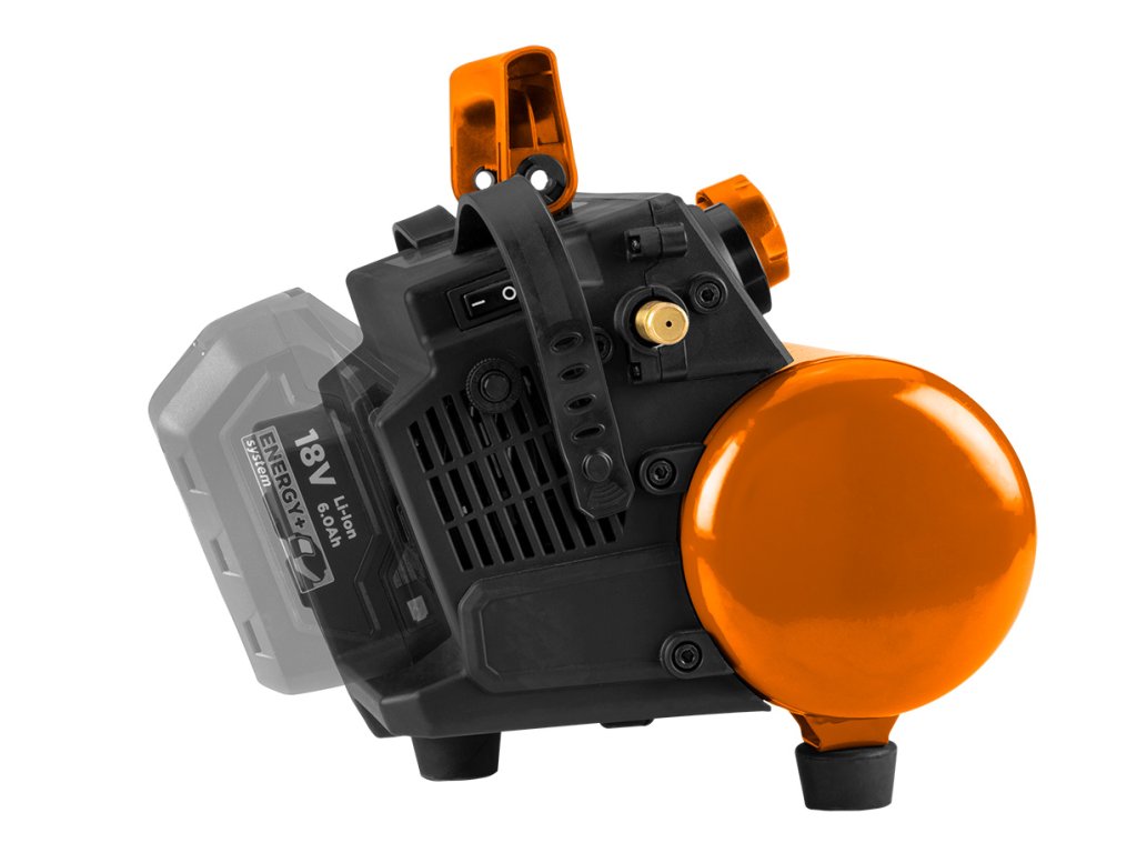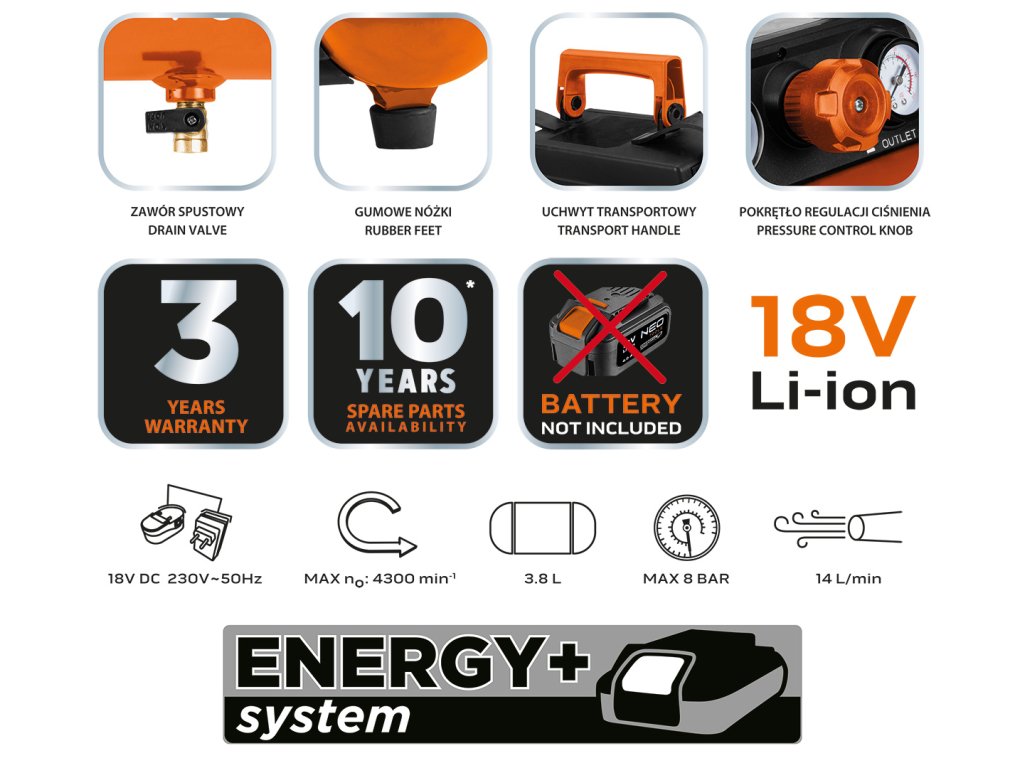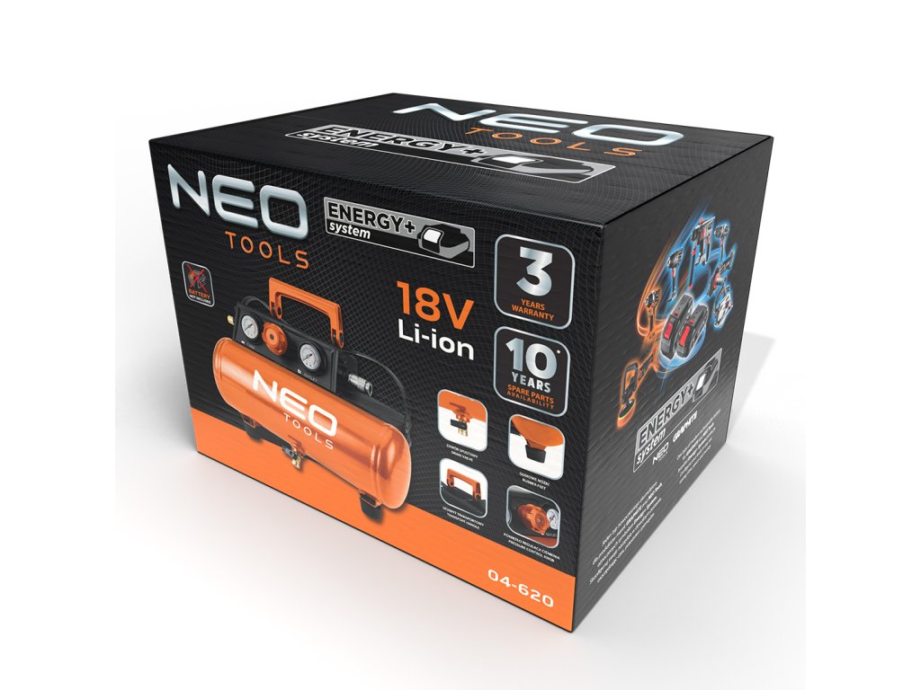 18-voltový akumulátorový kompresor Energy+ 04-620 od spoločnosti NEO je bezolejové zariadenie, ktoré funguje s akumulátorovým systémom Energy+. Má objem nádrže 3,8 litra, maximálny tlak 8 barov a výkon 14 litrov za minútu. Kompresor NEO sa odporúča na čerpanie, vyfukovanie nečistôt a napájanie malého pneumatického náradia. Bude užitočný pre automobilových fanúšikov, mechanikov, skrutkovačov a pre domáce použitie. Prístroj má čas nečinnosti 10 minút s batériami s kapacitou 2 Ah, 20 minút s batériami s kapacitou 4 Ah a 30 minút s batériami s kapacitou 6 Ah. Prístroj odporúčaný na mnohé úlohy.