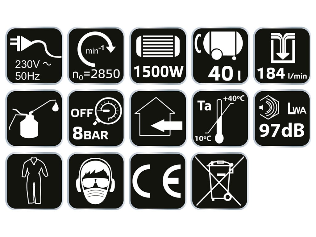 Olejový kompresor, vertikálny 40 l, 230 V / 50 Hz, výkon 1 500 W, spotreba vzduchu 184 l/min, hladina hluku 97 dB