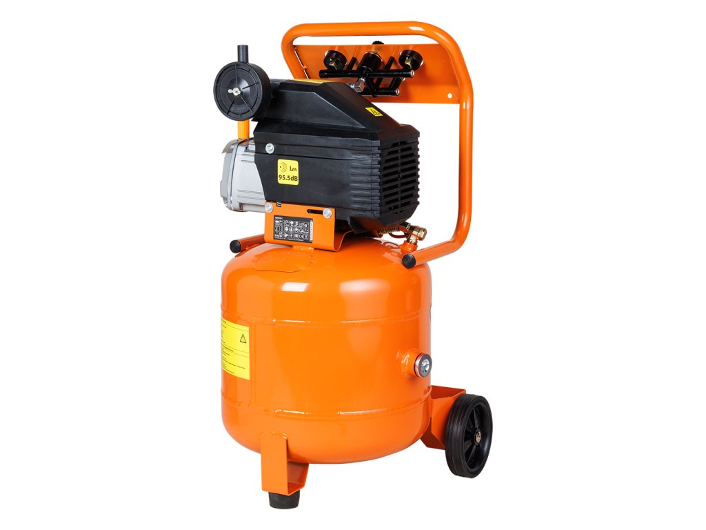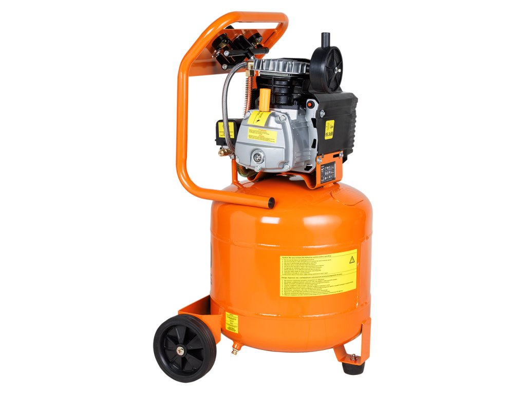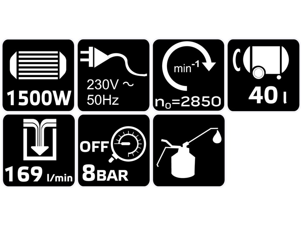 Olejový kompresor, vertikálny, objem nádrže 40 l, napájanie 230 V / 50 Hz, výkon motora 1500 W, 2850 ot/min, výkon 169 l/min, maximálny tlak 8 barov (115 PSI), intenzita hluku: 97 dB, IPX0, S1, trieda ochrany I, rozmery nádrže: F380*150, hmotnosť 31 kg, dve kolieska s priemerom 14,6 cm, dva manometre, dve ?" prípojky, regulátor tlaku, 225 ml fľaša oleja súčasťou dodávky, čas plnenia nádrže: 152 s.