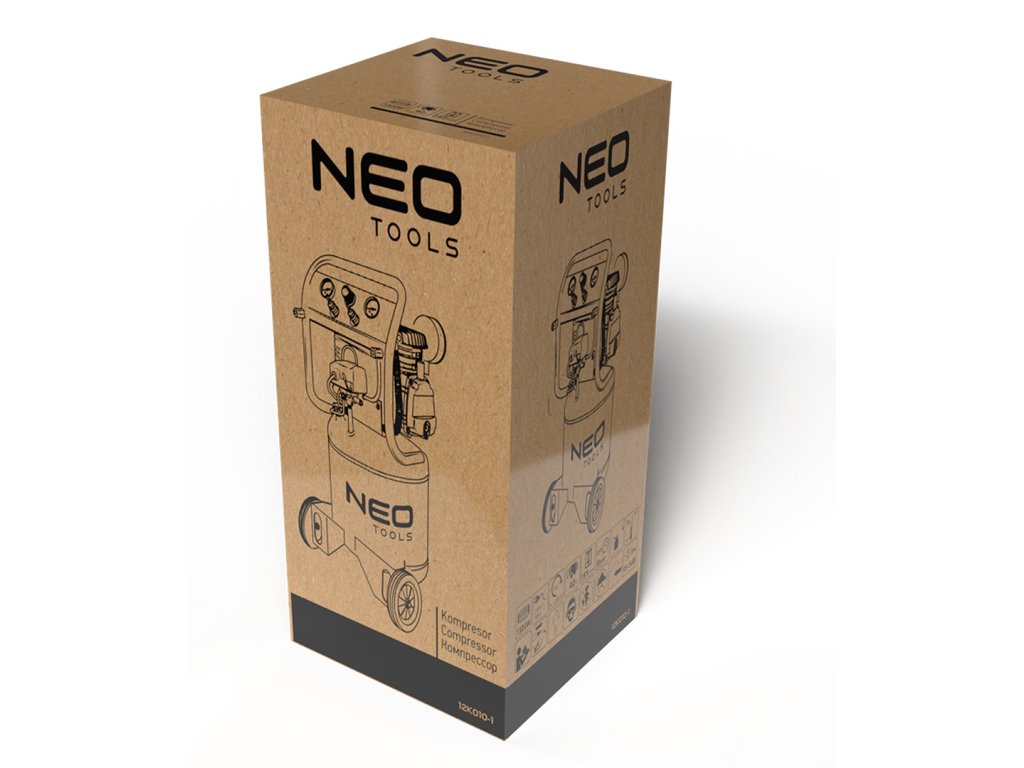 Vertikálny olejový kompresor 12K010-1 s objemom 40 litrov a napätím 230 V od spoločnosti NEO TOOLS je olejový kompresor s objemom 40 litrov a výkonom 1 500 W. Vyžaduje napájanie 230 V/50 Hz. Vyznačuje sa prívodom vzduchu 169 l/min, maximálnymi otáčkami 2 850 ot/min, časom plnenia 152 sekúnd a intenzitou hluku 97 dB. Vďaka svojej vertikálnej konštrukcii zaberá vertikálny olejový kompresor NEO TOOLS málo miesta, pričom si zachováva plnú kapacitu pre tento typ zariadenia. Odporúča sa do profesionálnych dielní, kde je veľmi dôležitý ľahký prístup ku konektorom, regulácii tlaku a manometrom, ako aj možnosť práce so širokou škálou pneumatického náradia. Vďaka pohodlnej rukoväti sa ľahko prenáša.