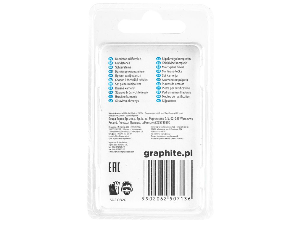 brúsny kameň GRAPHITE (kat. č. 55H056) v tvare guľôčky s priemerom 6 mm a dĺžkou 10 mm. Sada obsahuje 3 kusy. Sú určené na použitie s mini mlynčekom. Brúsny kameň je vyrobený z oxidu hlinitého. Vhodný na ostrenie, vyhladzovanie, odstraňovanie ostrín a všeobecné brúsenie väčšiny materiálov. Možno použiť na: kovy, odliatky, zvárané spoje, nity, odstraňovanie hrdze, keramiku, sklo, drevo, plasty.