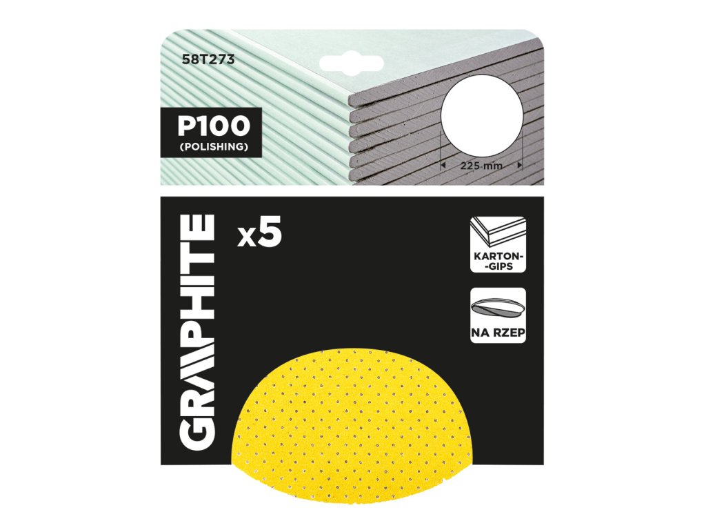 Brúsne kotúče, perforované, suchý zips s otvormi 225 mm, P100, 5 kusov 58T273 od spoločnosti GRAPHITE je sada 5 kusov brúsnych kotúčov určených na brúsenie omietok a sadrokartónu. Je kompatibilná s brúskami typu "žirafa" a konzolovými zariadeniami s priemerom 225 mm. Kotúče GRAPHITE sú po celom povrchu vybavené perforovanými otvormi, takže brúsny prach je počas práce plynulo odvádzaný. Zároveň sa pracovná plocha počas brúsenia príliš nezahrieva a upevnenie na suchý zips umožňuje rýchlu výmenu opotrebovaného príslušenstva. Kotúče sa vyznačujú elektrokorundovým zrnom a otvoreným typom zrnitosti. Brúsne kotúče GRAPHITE sa odporúčajú na mnohé úlohy.