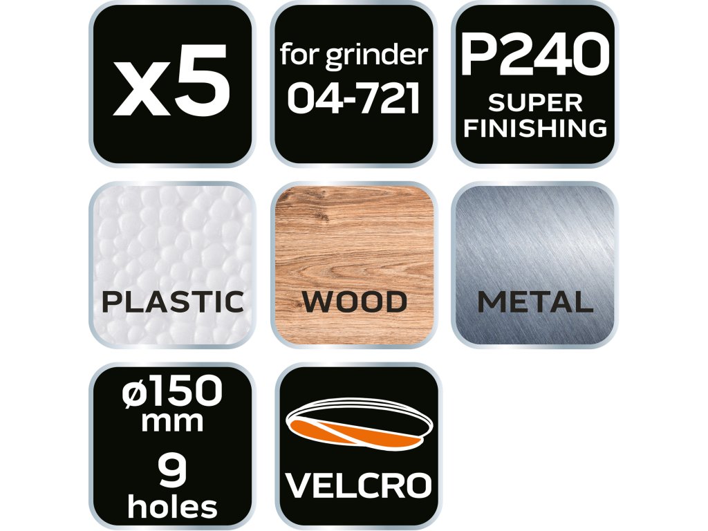 Brúsne kotúče 150 mm, P240, 5 ks, s 9 otvormi pre 04-721 08-996