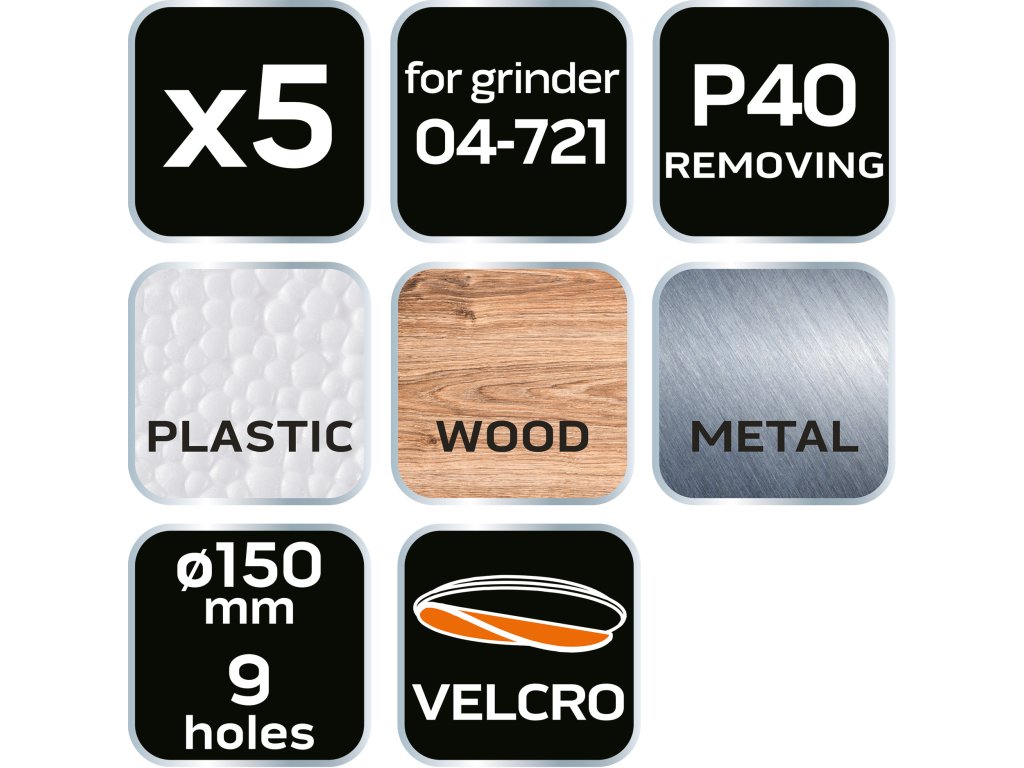 Brúsne kotúče 150 mm, P40, 5 ks, s 9 otvormi pre 04-721 08-990