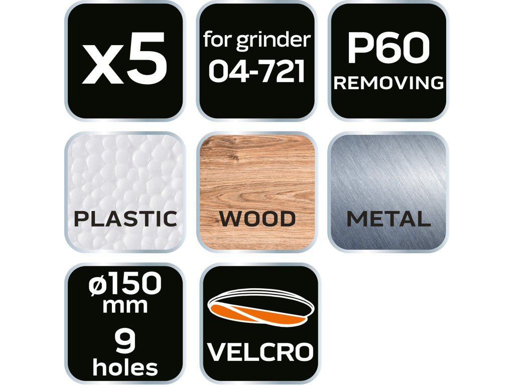 Brúsne kotúče 150 mm, P60, 5 ks, s 9 otvormi pre 04-721 08-991