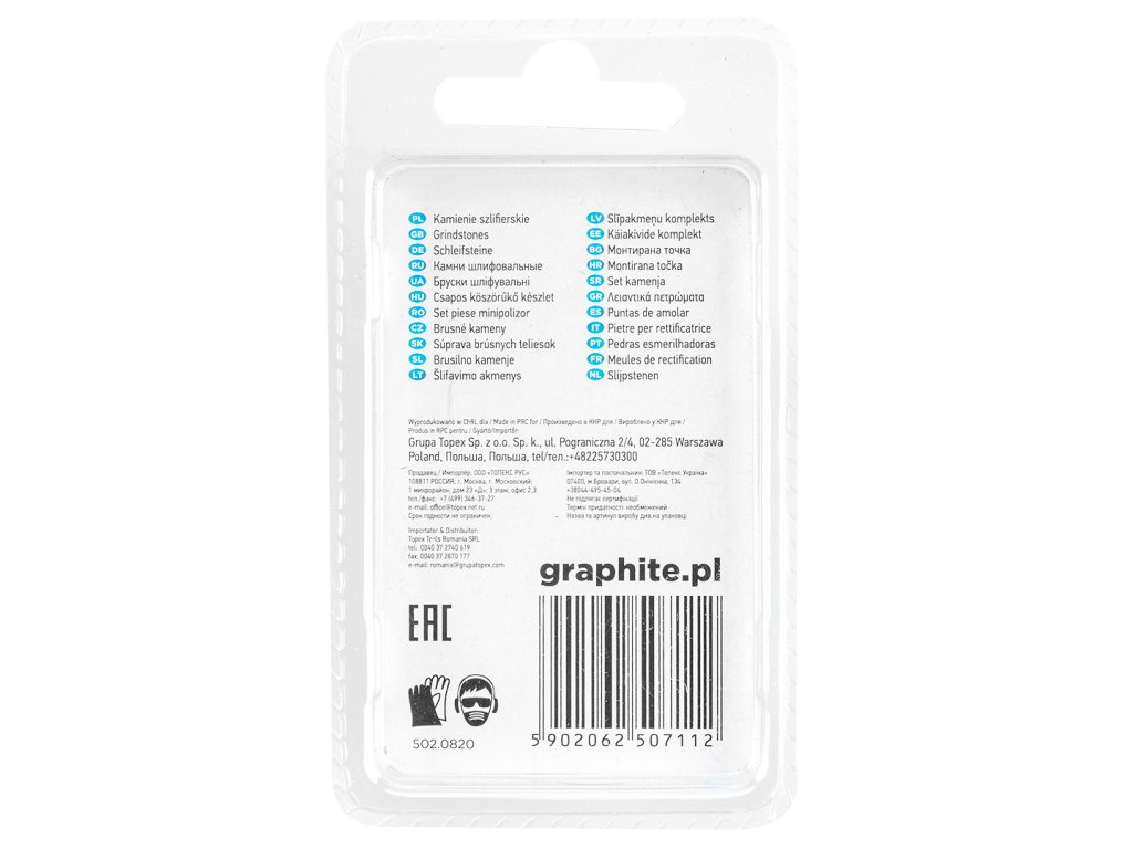 brúsny kameň GRAPHITE (kat. č. 55H054) v tvare kužeľa s priemerom 5 mm a dĺžkou 10 mm. Sada obsahuje 3 kusy. Sú určené na použitie s mini mlynčekom. Brúsny kameň je vyrobený z oxidu hlinitého. Vhodný na ostrenie, vyhladzovanie, odstraňovanie ostrín a všeobecné brúsenie väčšiny materiálov. Vhodné na: kovy, odliatky, zvárané spoje, nity, odstraňovanie hrdze, keramiku, sklo, drevo, plasty.