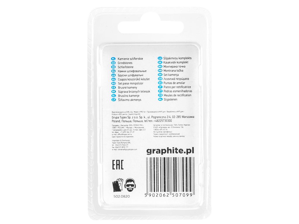 brúsny kameň GRAPHITE (kat. č. 55H052) valcový, priemer 10 mm a dĺžka 12 mm. Sada obsahuje 3 kusy. Sú určené na použitie s mini mlynčekom. Brúsny kameň je vyrobený z oxidu hlinitého. Vhodný na ostrenie, vyhladzovanie, odstraňovanie ostrín a všeobecné brúsenie väčšiny materiálov. Vhodné na: kovy, odliatky, zvárané švy, nity, odstraňovanie hrdze, keramiku, sklo, drevo, plasty.