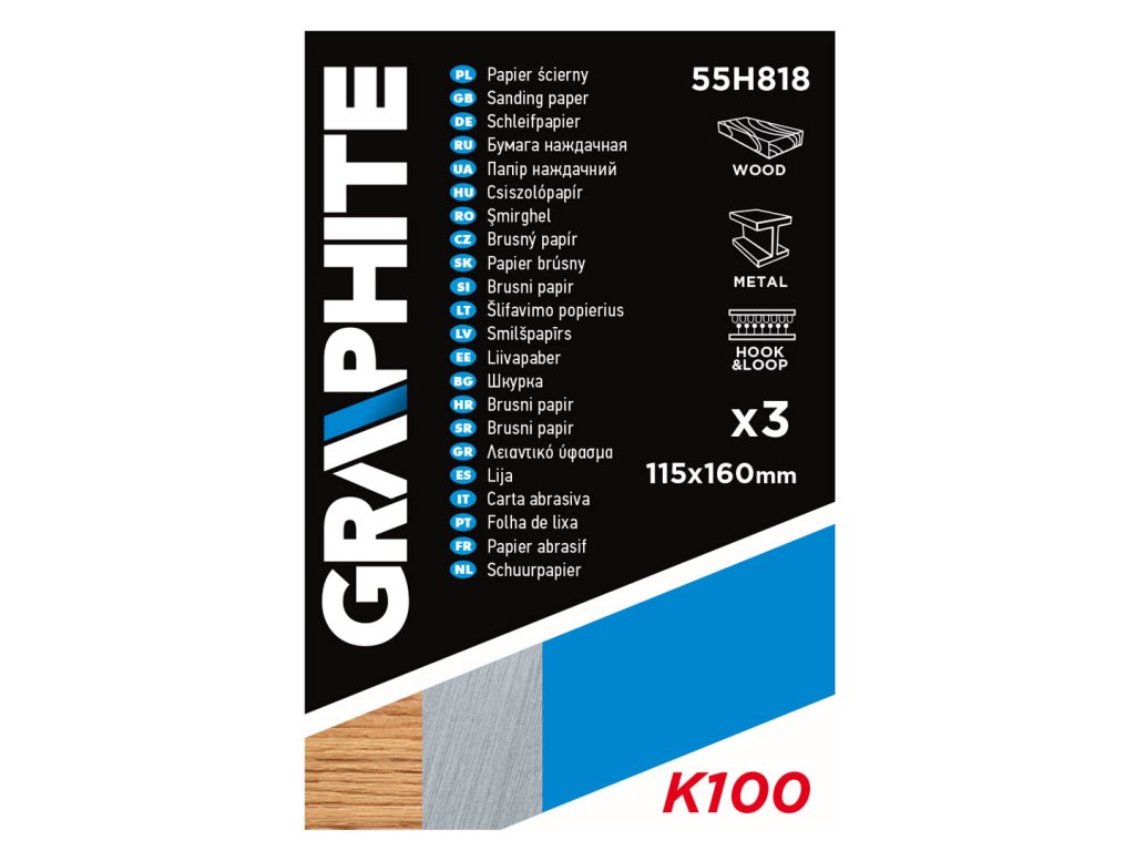 115 x 160 mm Brúsne papiere GRAPHITE (ref. 55H818) umožňujú efektívne brúsenie drevených a kovových povrchov pomocou multifunkčného nástroja GRAPHITE. Zrnitosť K100 umožňuje hrubé brúsenie. Systém otvorov umožňuje odsávanie prachu počas práce.