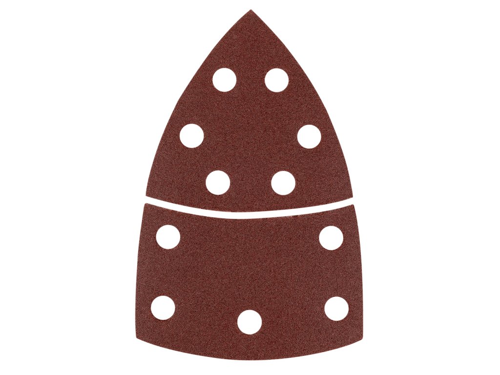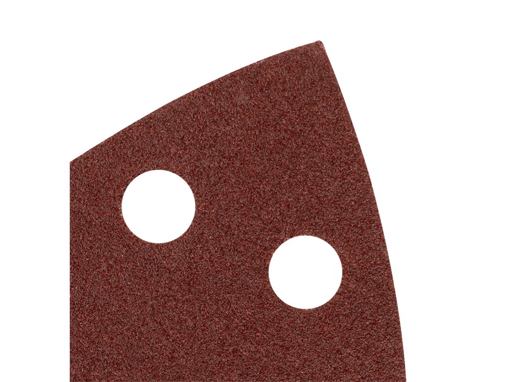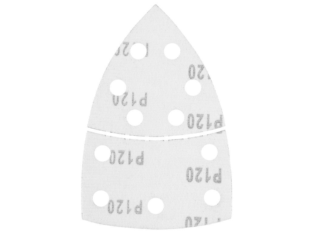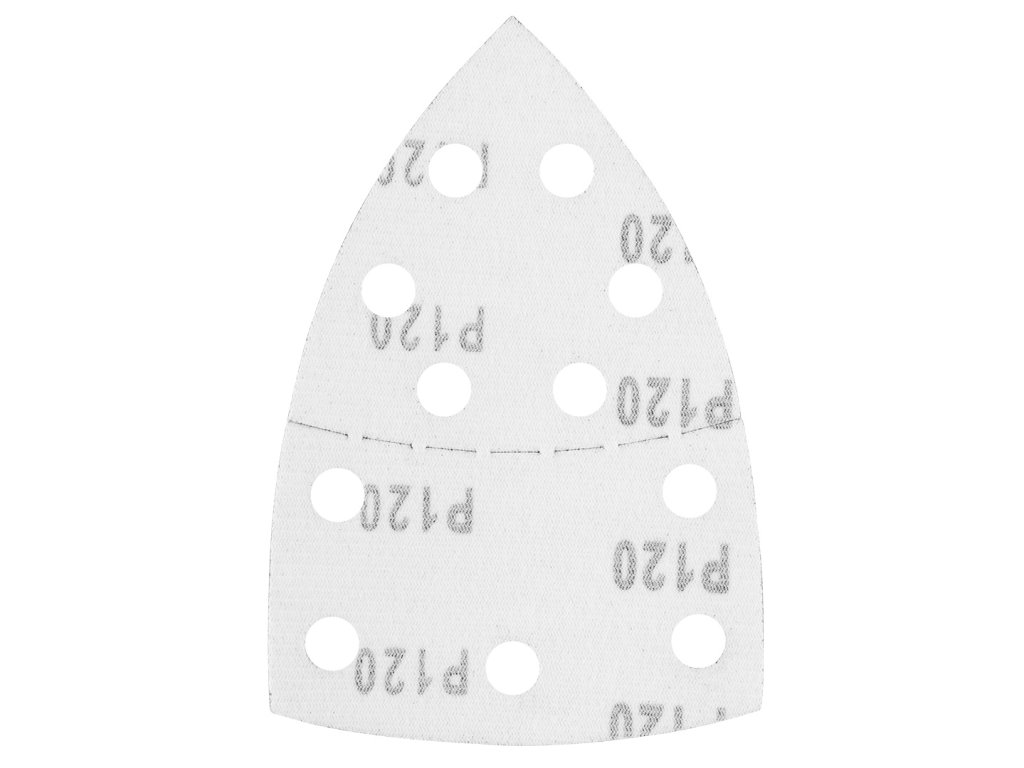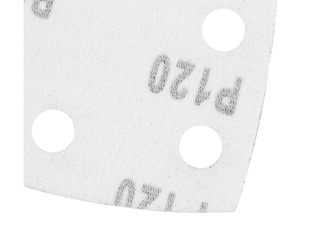 Brúsne papiere na suchý zips, žehlička 102 x 152 mm, P120, 5 kusov, s 11 otvormi 58T304 od GRAPHITE je sada 5 kusov brúsnych papierov na suchý zips, 102 x 152 mm. Vyznačujú sa výrezom v tvare tzv. žehličky - s možnosťou oddeliť jeden z kusov a nasadiť ho na brúsku s delta pätkou. Príslušenstvo má papierový podklad a elektrokorundový povlak. Sú určené na strojové použitie. Vďaka 11 otvorom na povrchu umožňujú ich použitie na brúskach vybavených systémom odsávania prachu. Upevnenie na suchý zips umožňuje rýchlu a jednoduchú výmenu brúsnych listov GRAPHITE. Sú vhodné na použitie na drevo, kov, plast, sklo a sadrokartón.