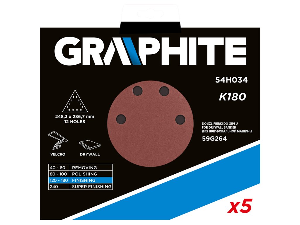 Brúsny papier s trojuholníkovými otvormi triedy K180, 5 ks, pre brúsky 59G264, 54H034 GRAPHITE. Balenie obsahuje päť kusov trojhranných listov, ktoré sú určené pre brúsku na sadru GRAPHITE 59G264. Príslušenstvo má praktické otvory. Brúsny papier so suchým zipsom je vyrobený z materiálu E. Vyznačuje sa polootvorenou vrstvou a zrnom z elektrokorundu. Bude vhodný na profesionálne použitie aj pri rôznych domácich prácach.