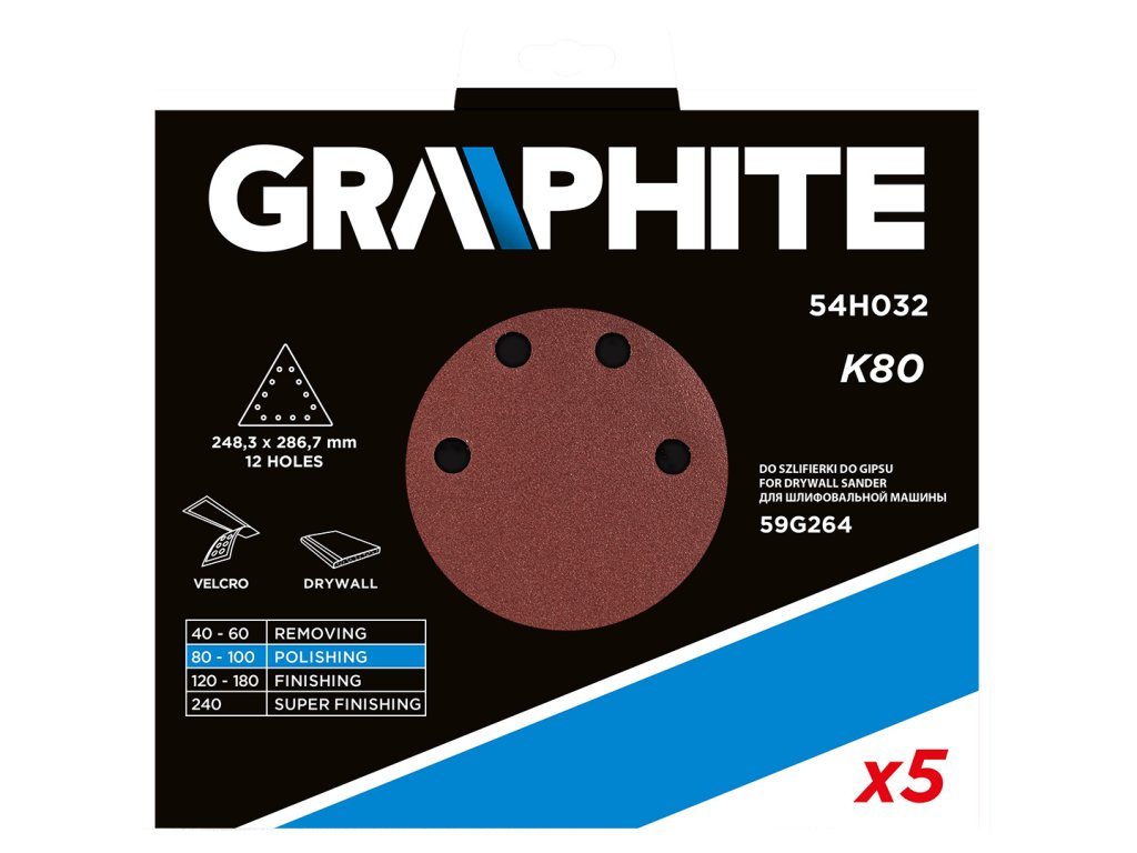 Brúsny papier s trojuholníkovými otvormi Velcro K80, 5 kusov, pre brúsku 59G264, 54H032 GRAPHITE so stupňom K80. Balenie obsahuje päť kusov trojuholníkových listov určených pre brúsku na omietky GRAPHITE 59G264. Príslušenstvo má praktické otvory. Brúsny papier so suchým zipsom je vyrobený z materiálu E. Vyznačuje sa polootvorenou vrstvou a zrnom z elektrokorundu. Bude vhodný na profesionálne použitie aj pri rôznych domácich prácach.